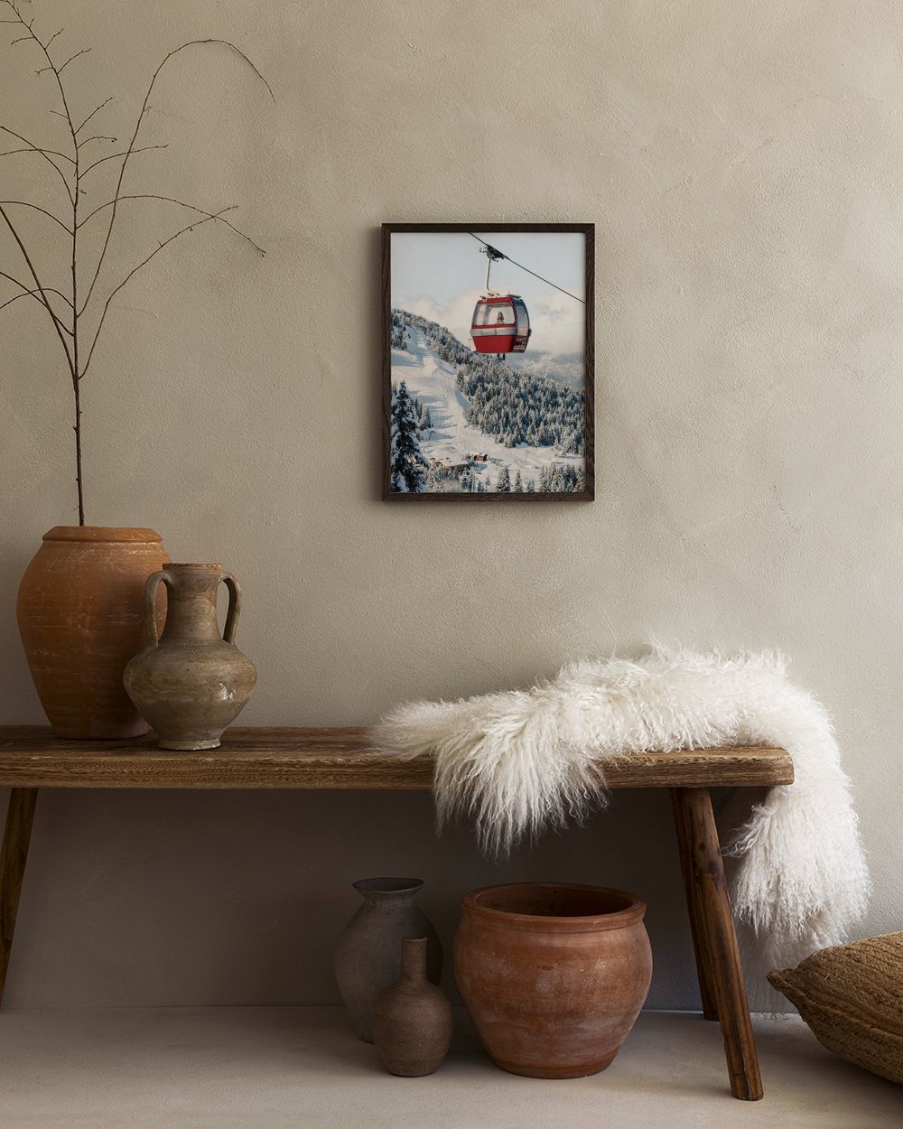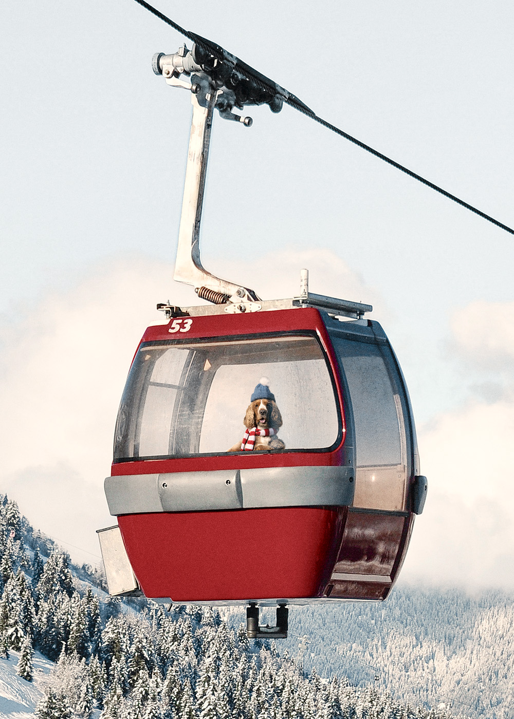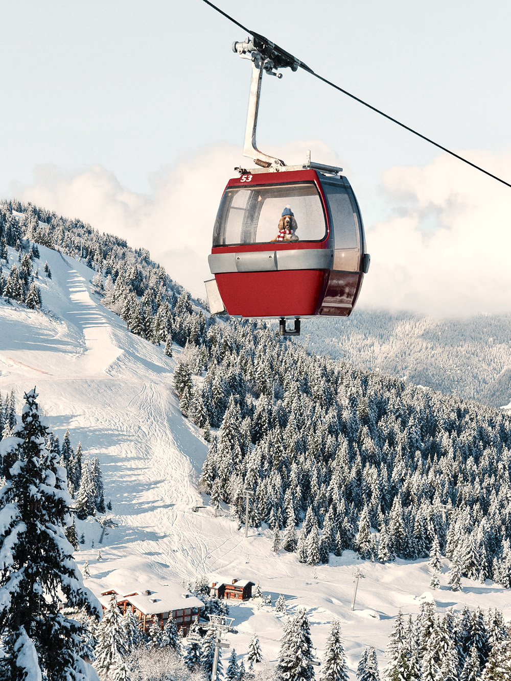 青空と白い雲の中の赤いケーブルカーのポスター。雪に覆われた木々と斜面が美しい冬の風景を描いた完璧なウォールアートです。