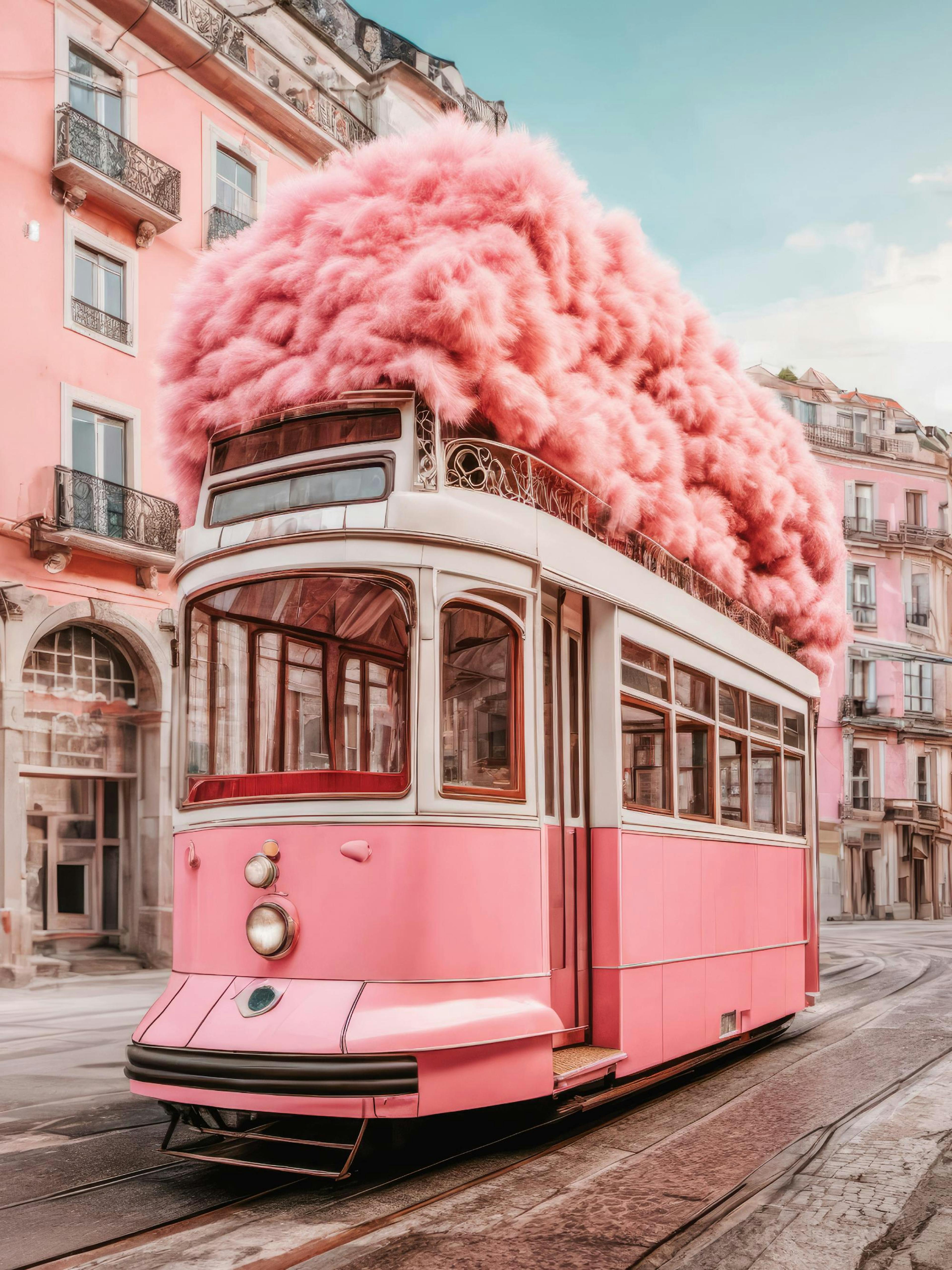 AI Art from The Imagine Collection: a charming pink tram with a furry roof, depicted in a European city.