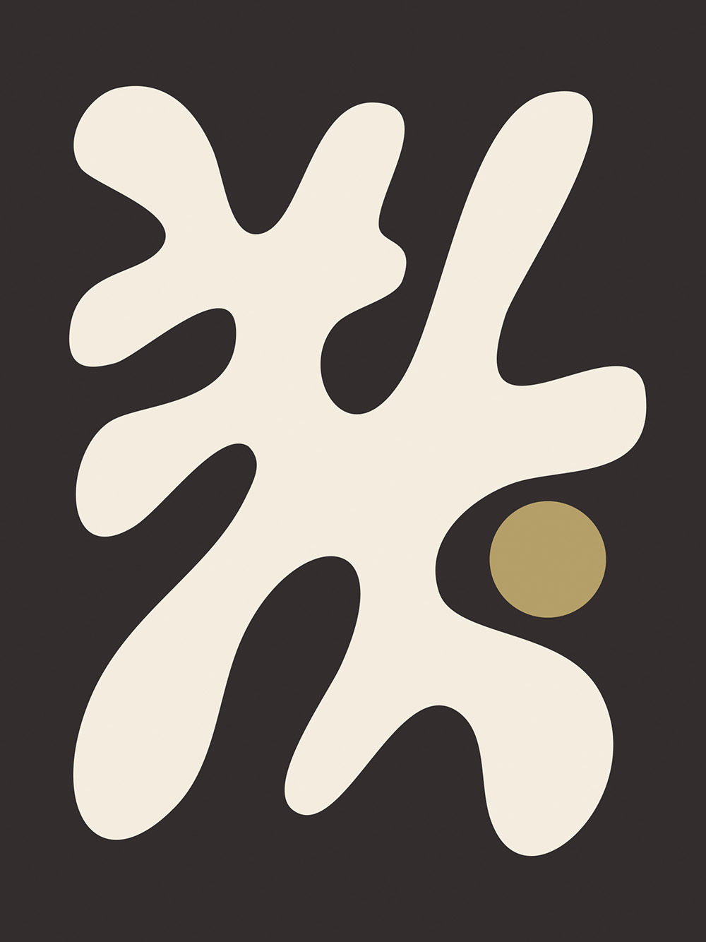 ダークな背景にクリーム色のスプラッター模様とベージュの円が描かれた抽象的なポスター。あなたのお家のためのシンプルでモダンなウォールアート。