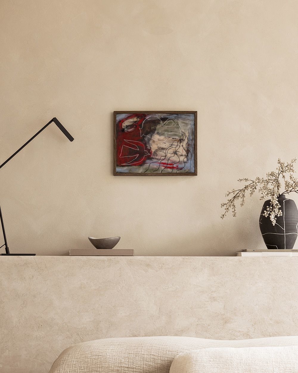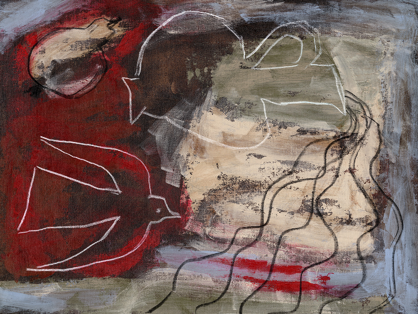 赤、ベージュ、茶色、黒で描かれた鳥のアウトラインが特徴的な抽象ポスター。雲のような背景に粗いテクスチャーと波状のラインが描かれています。