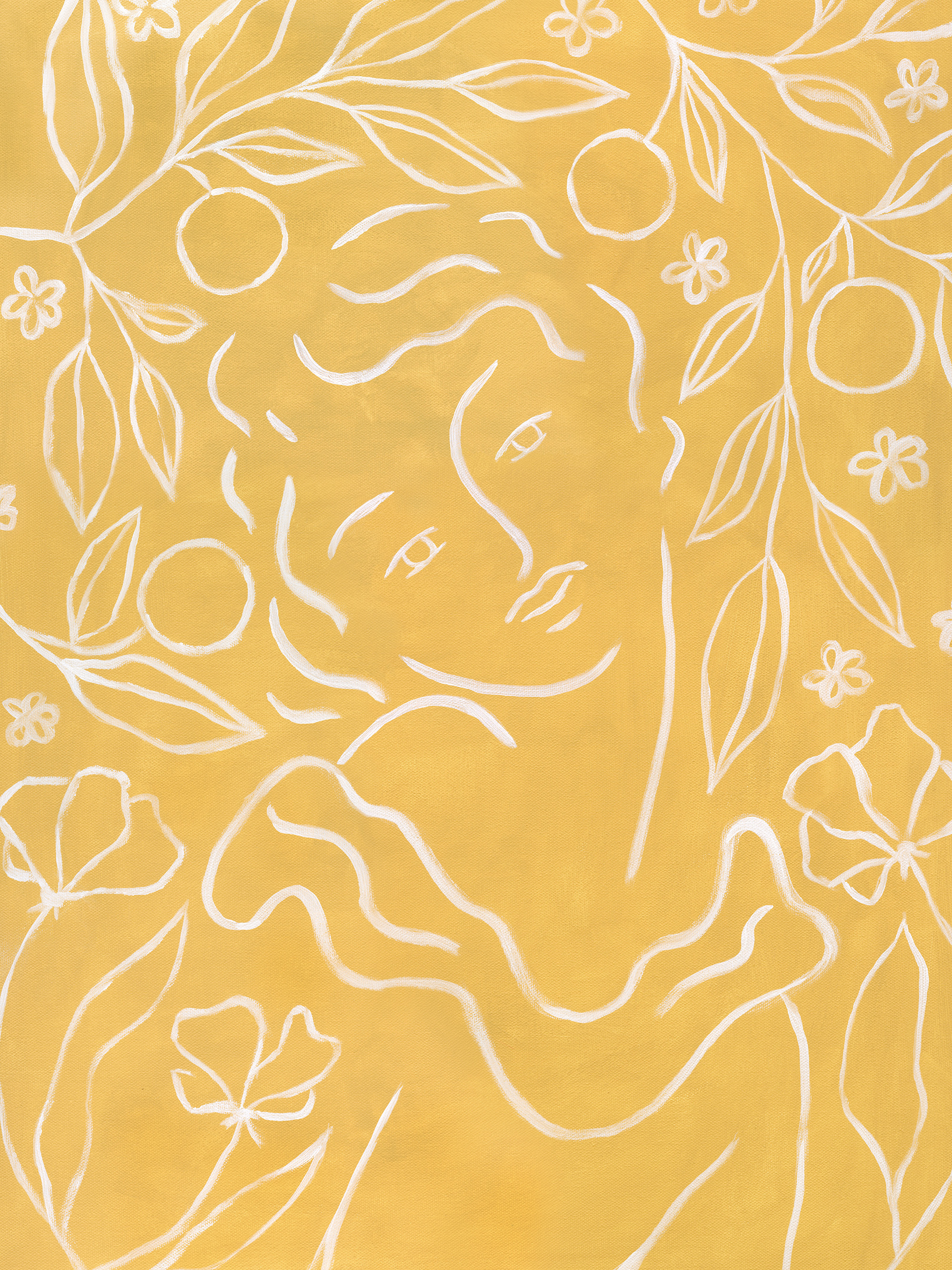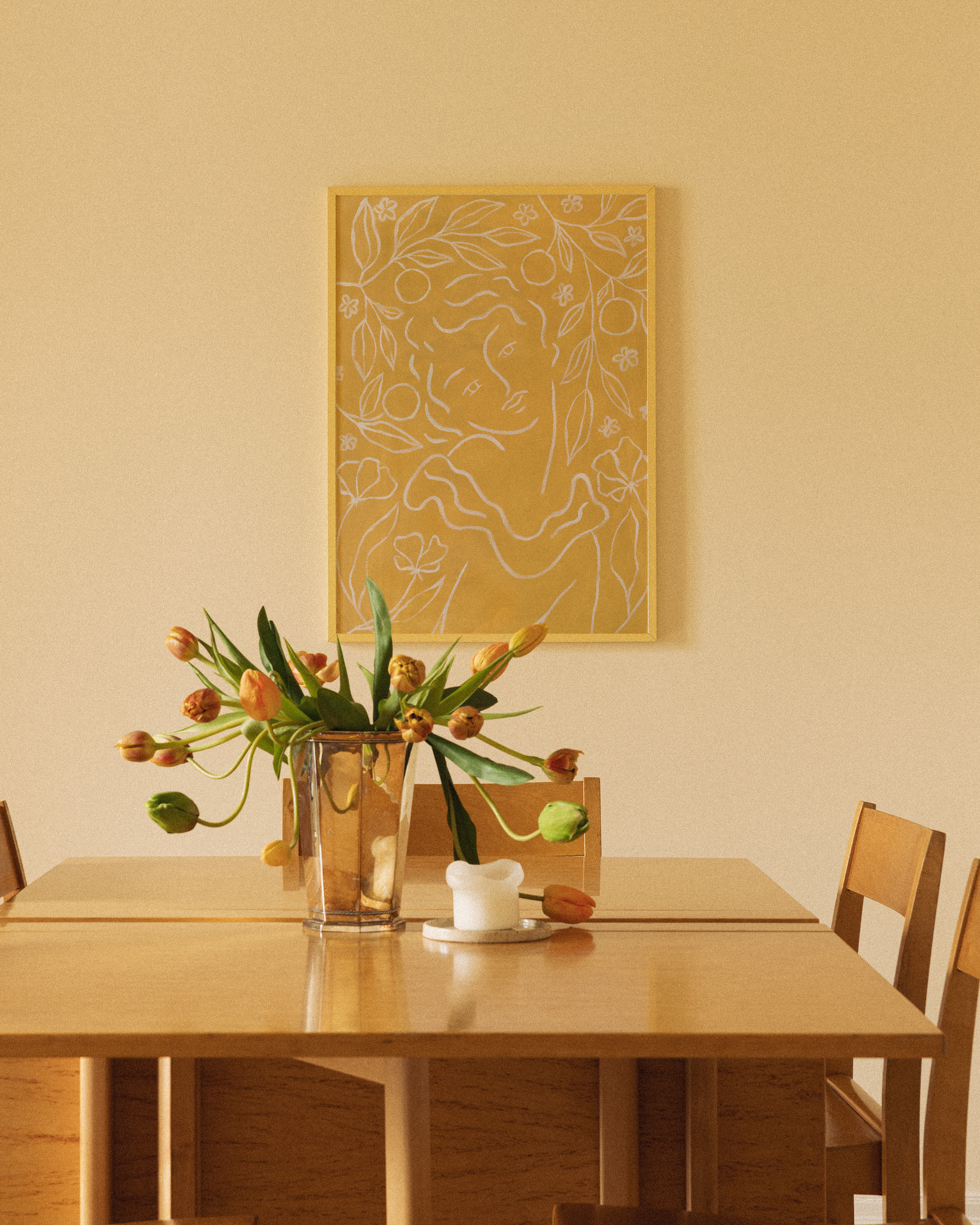 黄色い背景に顔、葉、花、果物のラインアートイラストが描かれたポスター。ミニマリストスタイルのシンプルでエレガントなウォールアート。