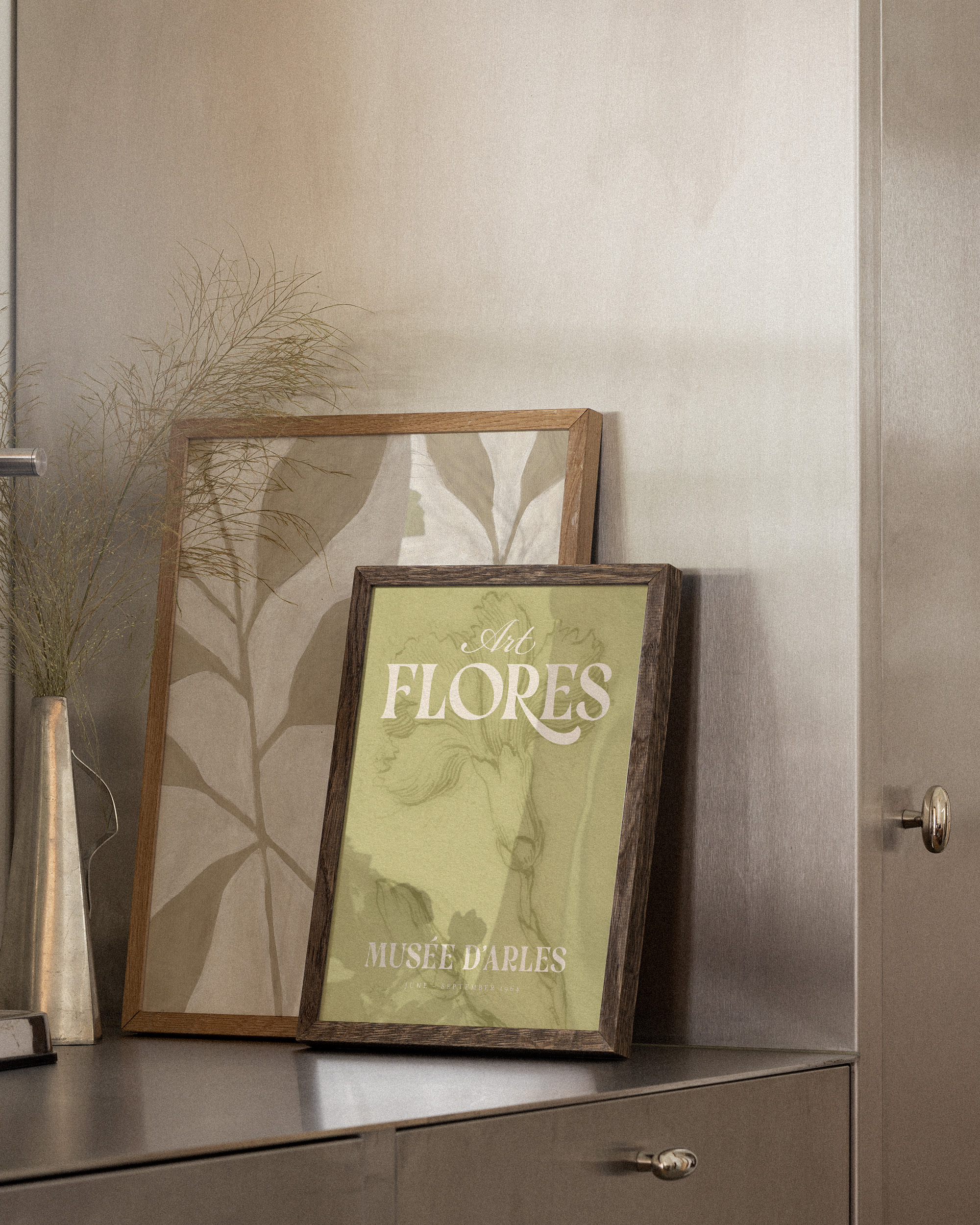 ライトベージュの背景にオフホワイトの大きな葉のような形を描いた抽象的なポスター。滑らかで反復的なパターンが特徴の、シンプルでエレガントなウォールアート。