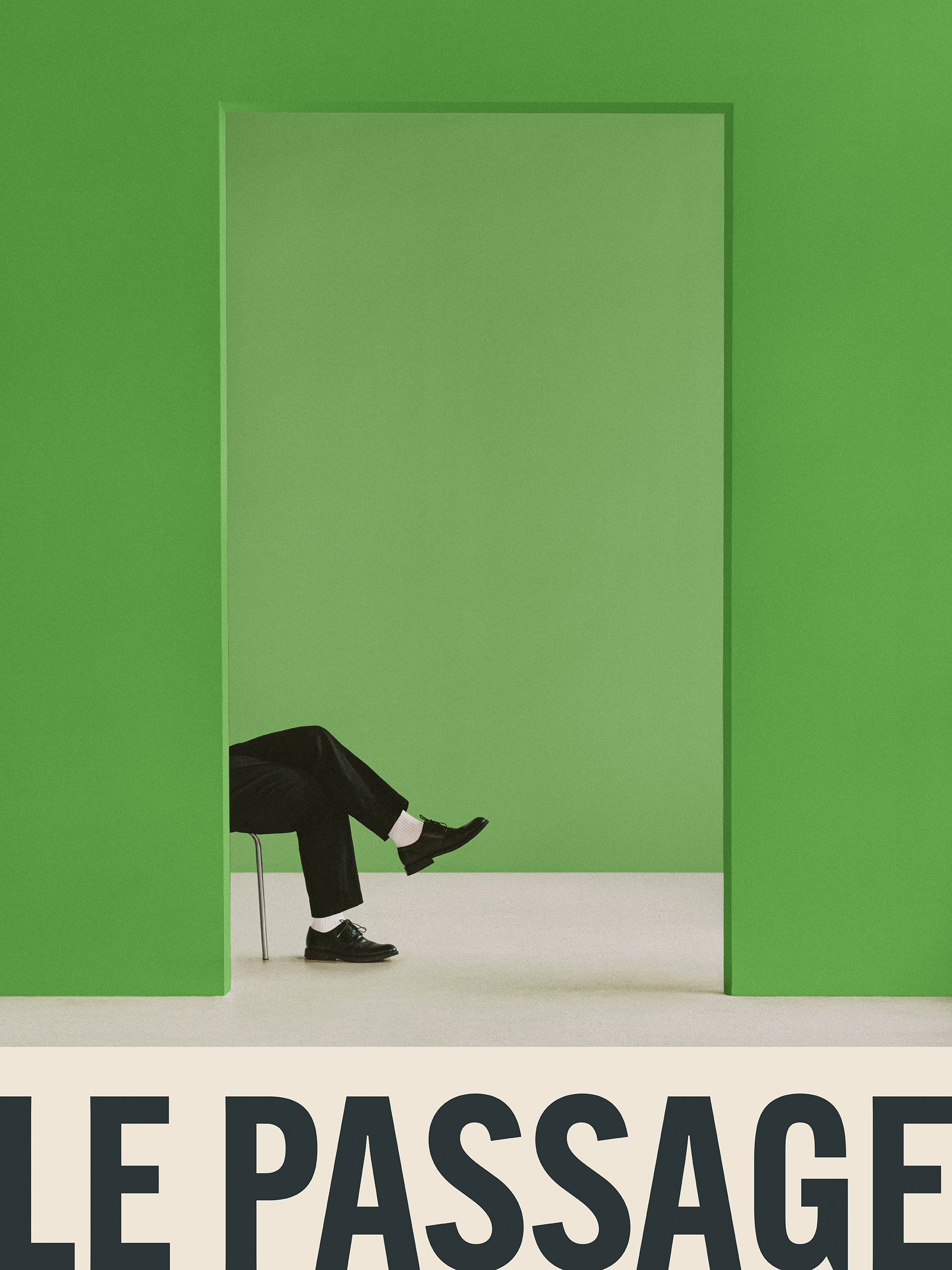緑の壁と出入り口、そして黒いズボンと靴を履いて座っている人物を描いたポスター。下部には「LE PASSAGE」というテキストが配置されています。