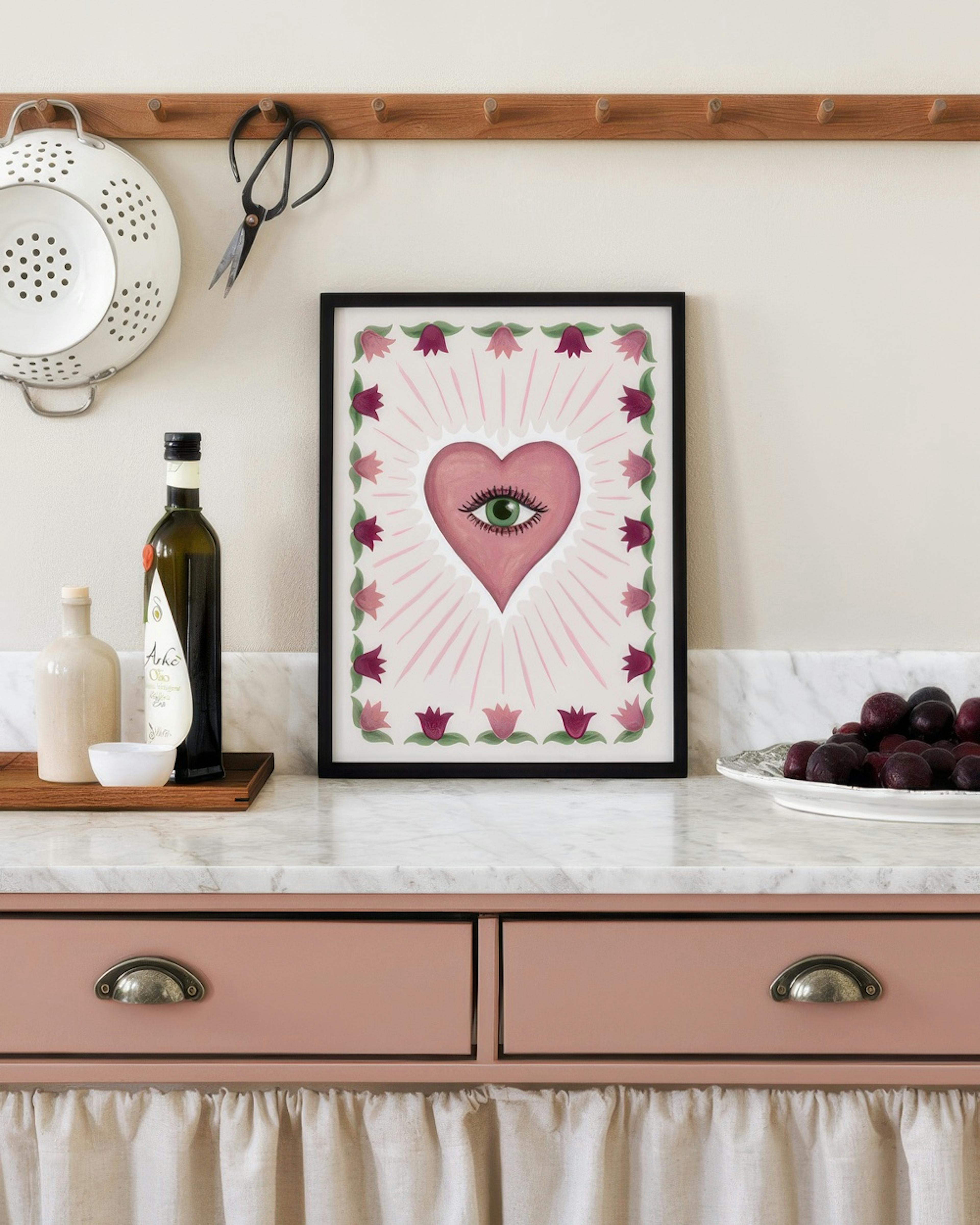 This illustrated print has a pink radiating heart with a captivating eye in the center. Bordered with charming red and pink tulips, this print truly adds a touch of love to your home. Perfect for art lovers and those who appreciate the power of love.
