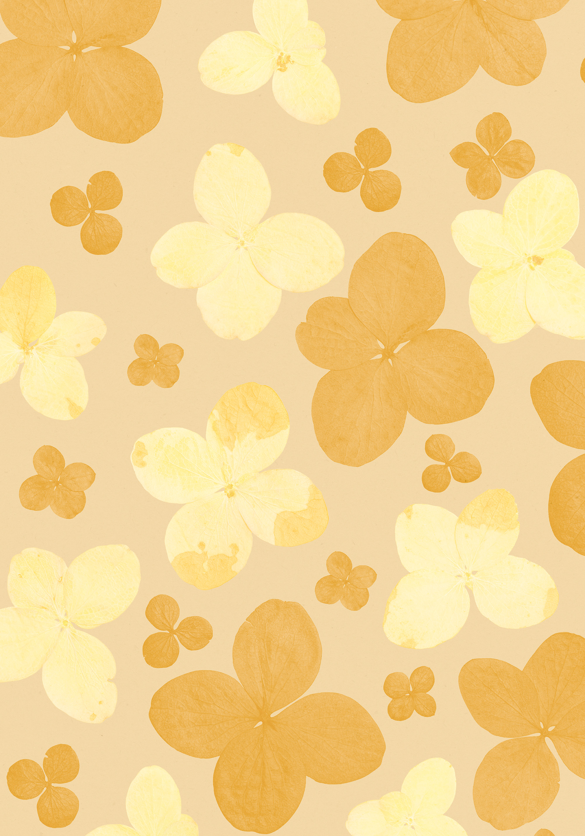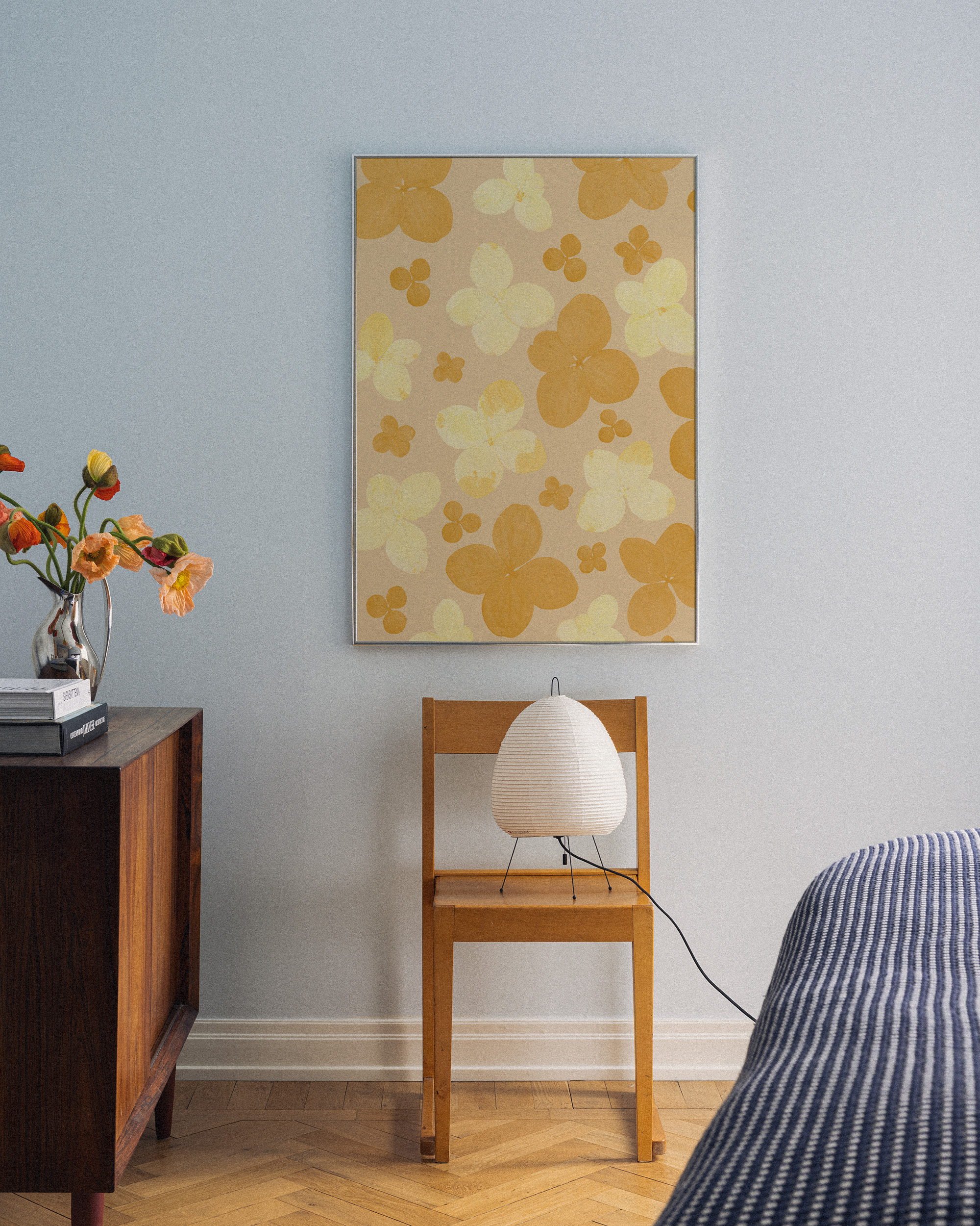 ベージュの背景に黄色とオレンジブラウンの美しい花柄が描かれたポスター。お部屋に温かみをプラスする完璧なウォールアートです。