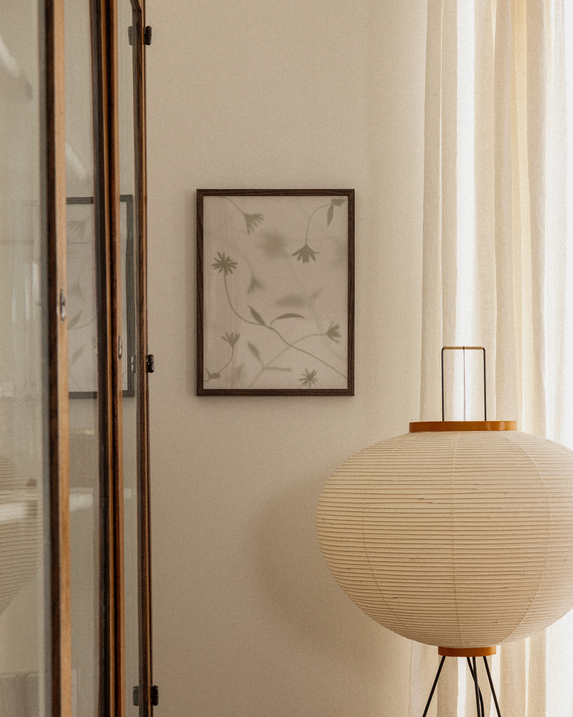 淡いベージュの背景に花や葉の柔らかな影が描かれたポスター。お部屋に穏やかな雰囲気を演出するのに最適なウォールアートです。