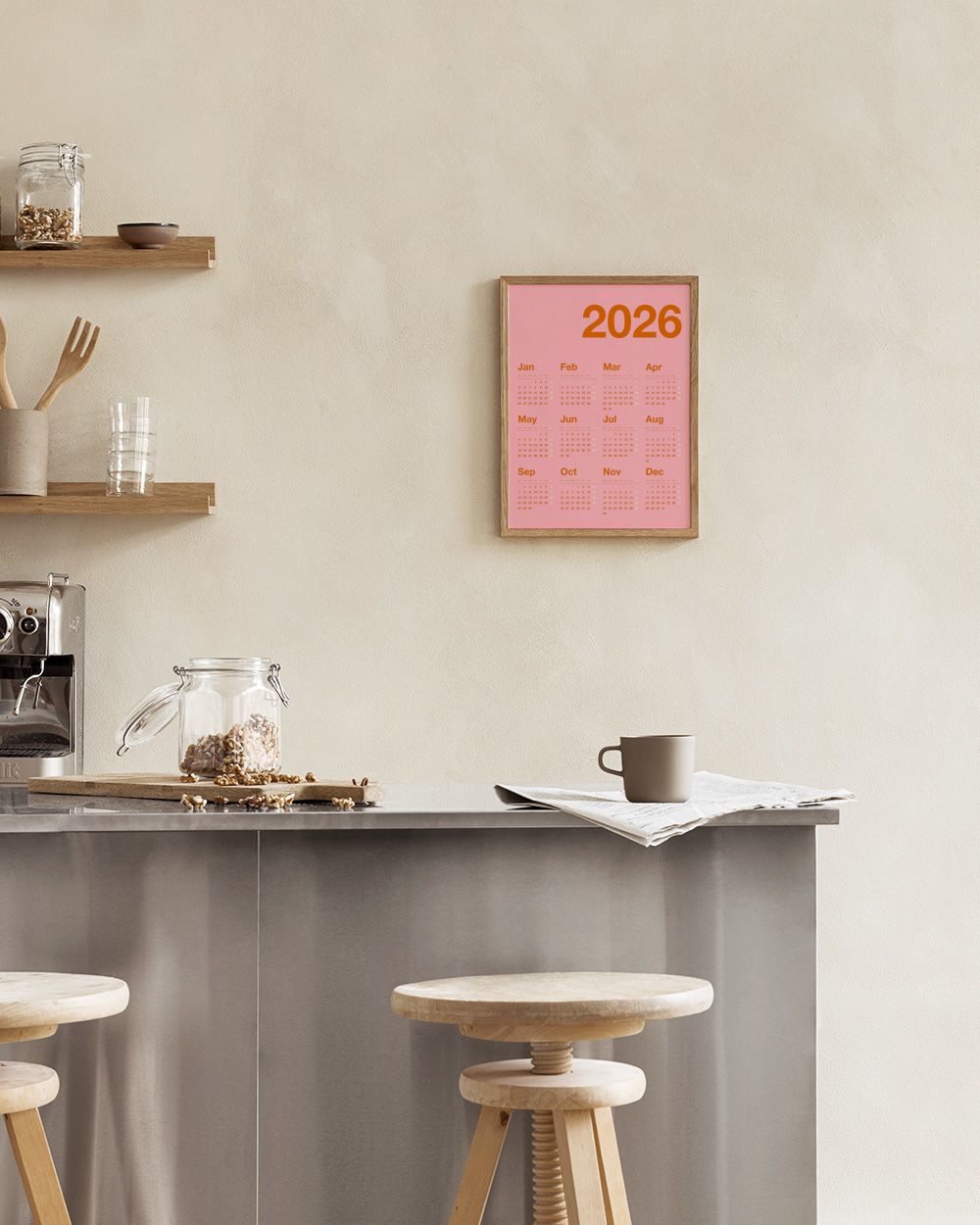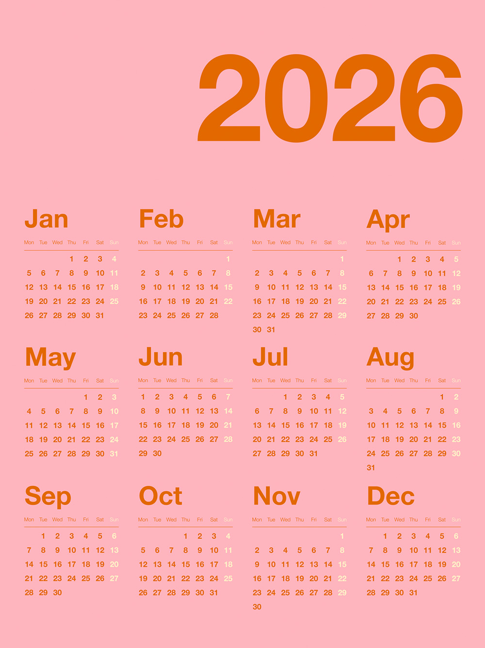1月から12月までの全ての月をシンプルなグリッドレイアウトで表示した、オレンジ色のテキストが特徴的な2026年のピンクカレンダーポスター。