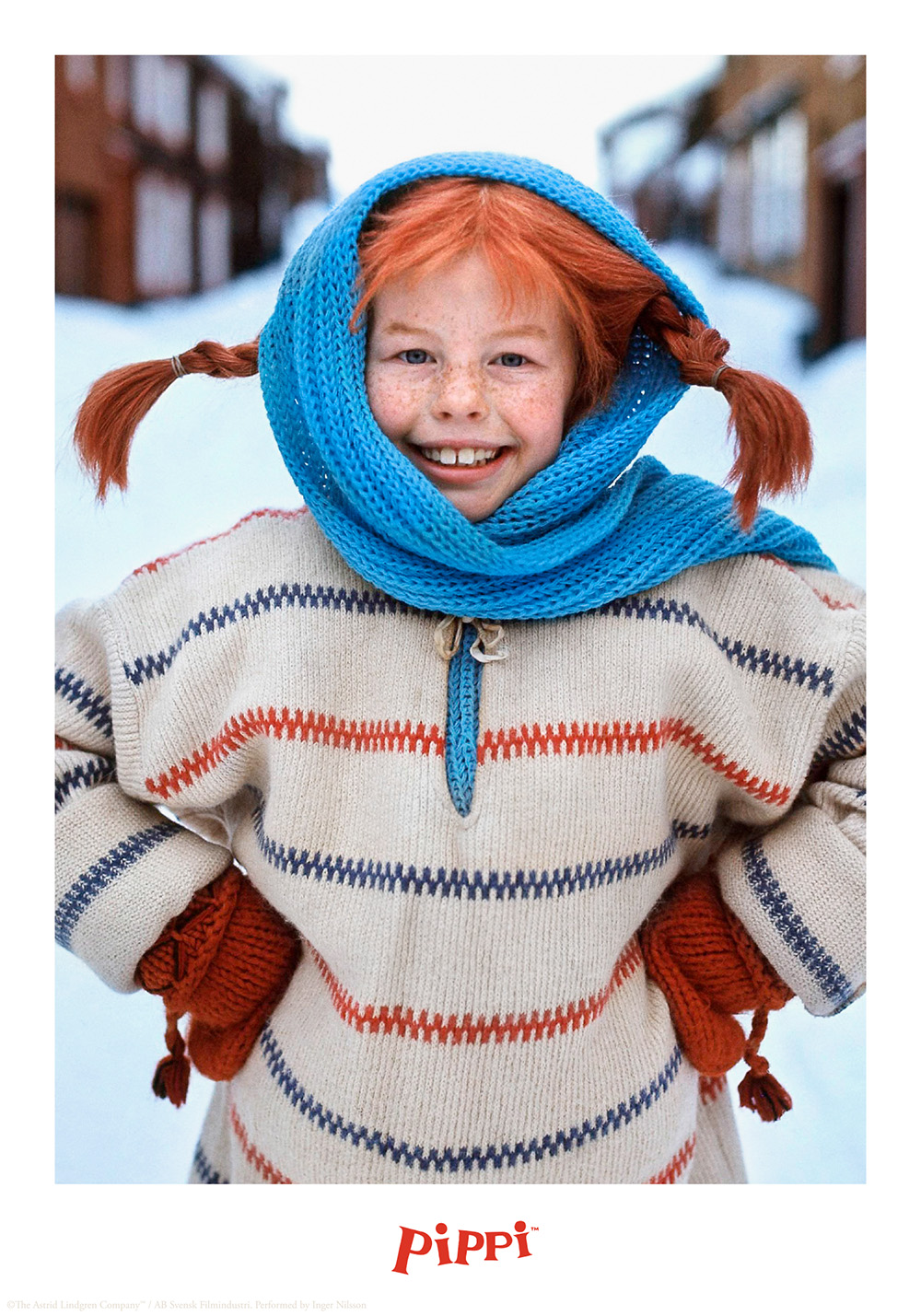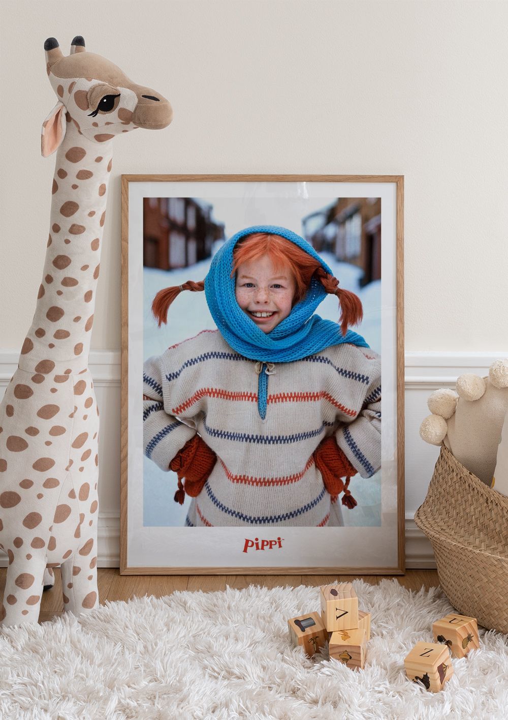 赤いおさげ髪で青いスカーフと縞模様のジャンパーを着たピッピ・ロングストッキングが、茶色い家々のある雪景色の中にいる楽しいポスター。