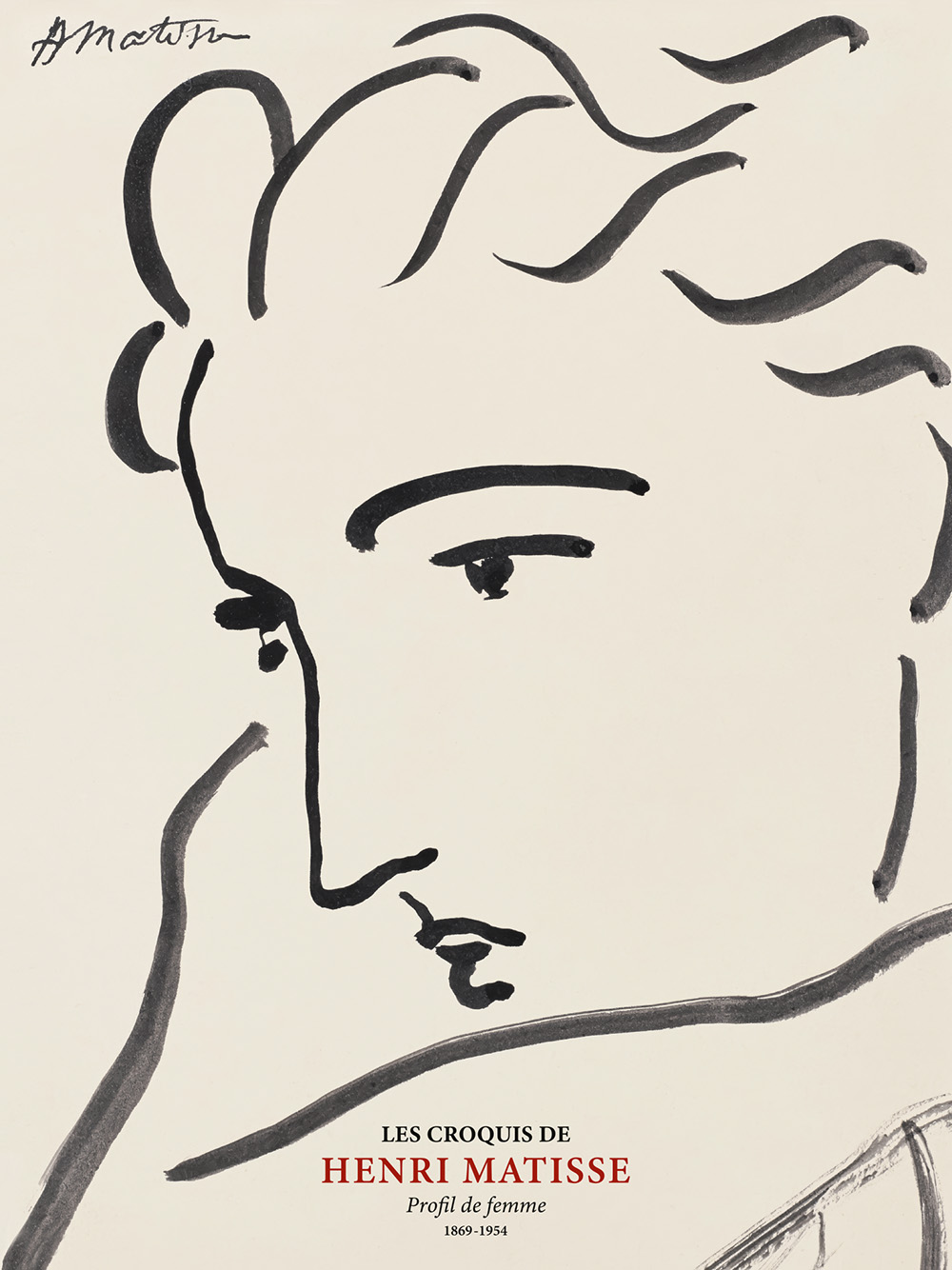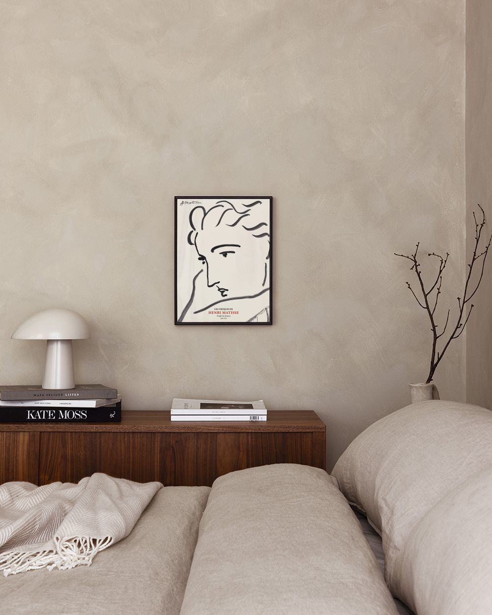 ウェーブのかかった髪の女性の横顔を描いたシンプルな黒い線画。この ミニマリストなポスターは、白い背景に赤と黒のテキストが配された、滑らかで流れるようなラインが特徴です。