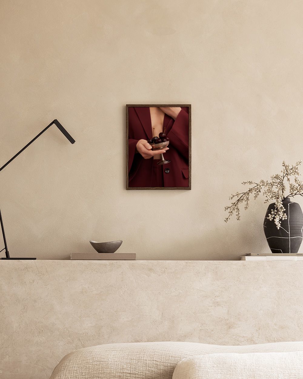 ダークレッドのブレザーを着た人物がシャイニーな赤いチェリーで満たされたシルバーカップを持っているスタイリッシュなポスター。