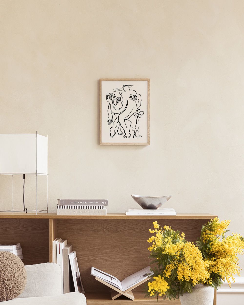 ベージュの背景に黒い流れるようなラインで描かれた二人のダンサーの抽象的なポスター。シンプルでミニマリストなアートスタイル。