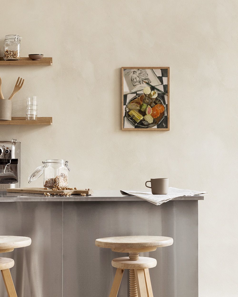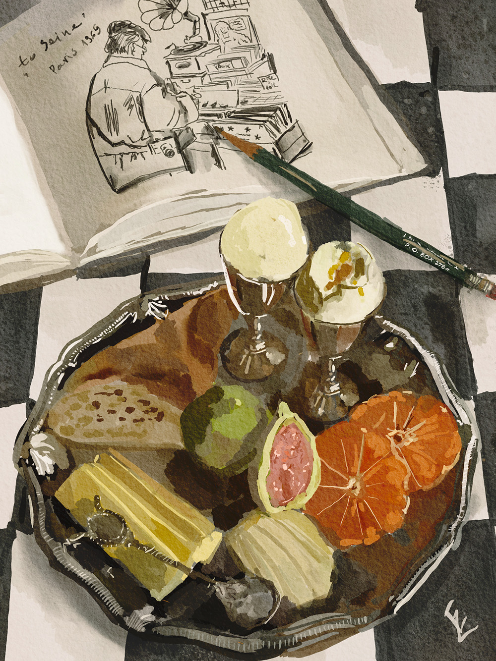 チェック柄の表面にカップ、オレンジスライス、いちじく、チーズが載った朝食トレイの水彩ポスター。近くにスケッチブックと緑色の鉛筆があります。