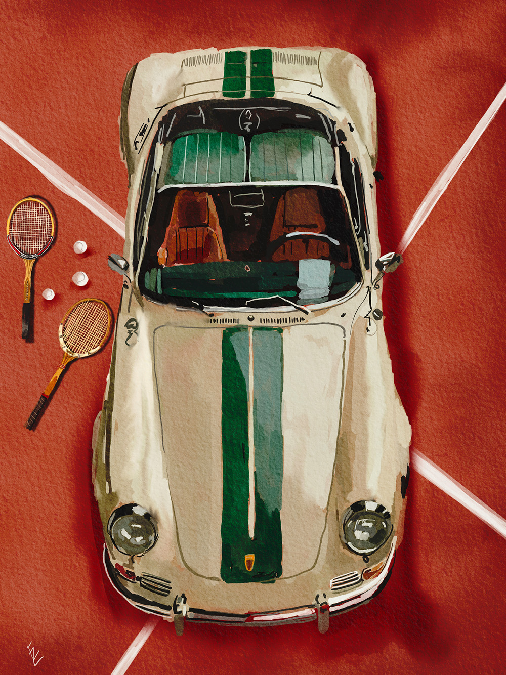 赤い背景に白いラインが描かれた、テニスラケットとボールを載せたクラシックな緑の車をフィーチャーした鮮やかなポスター。