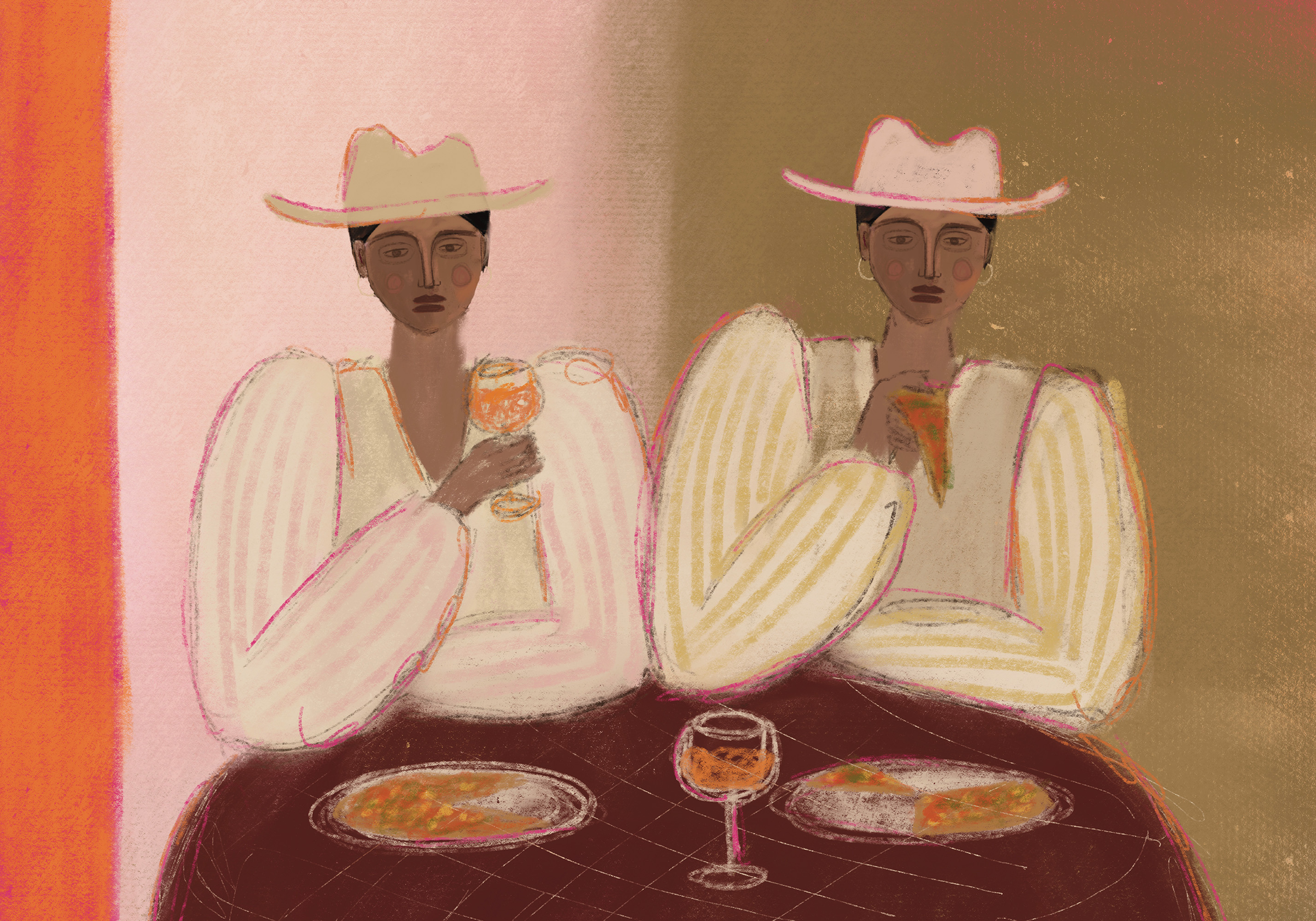帽子をかぶり縞模様の服を着た二人がテーブルに座り、ピンクとブラウンの背景にピザと飲み物が描かれたポスター。