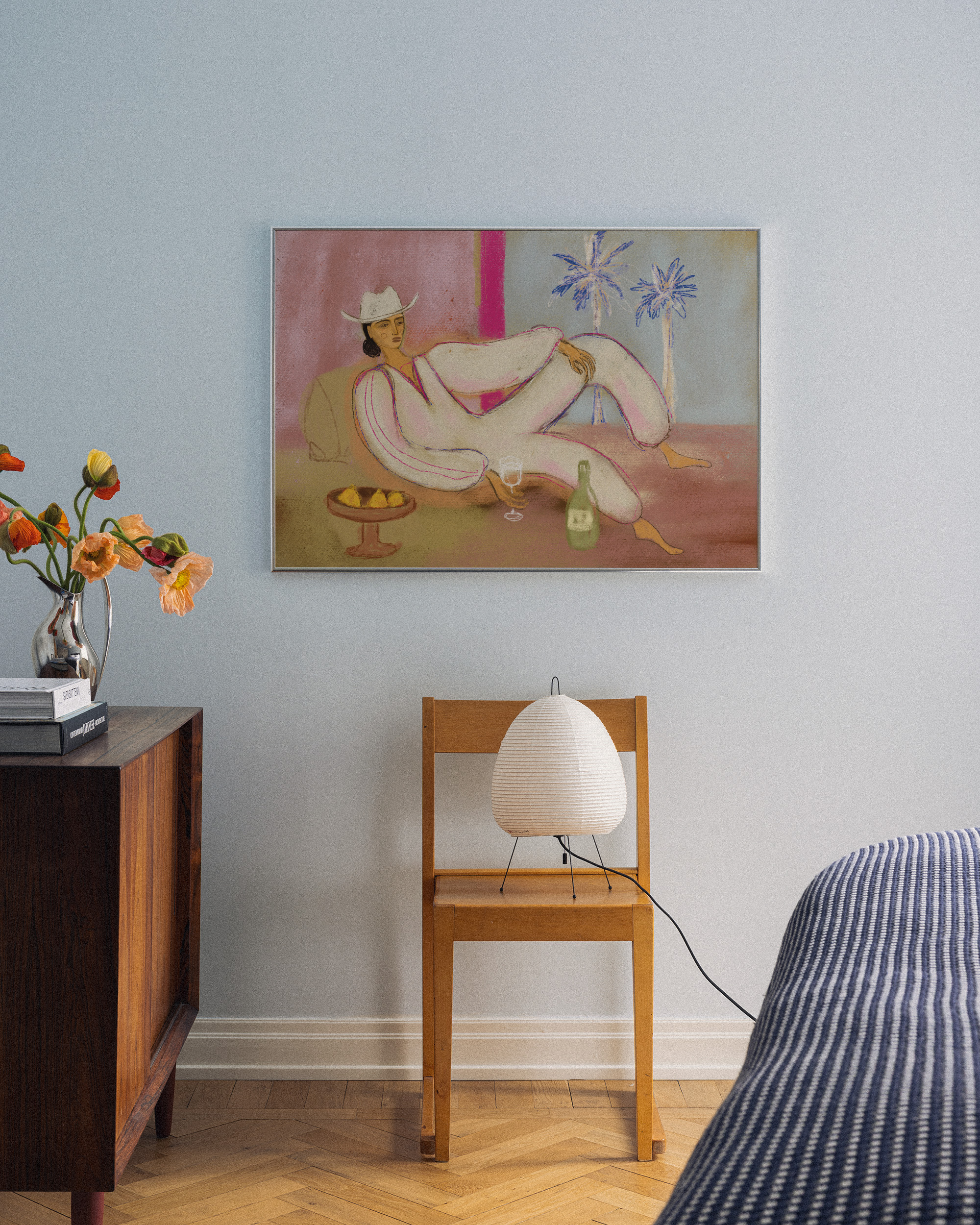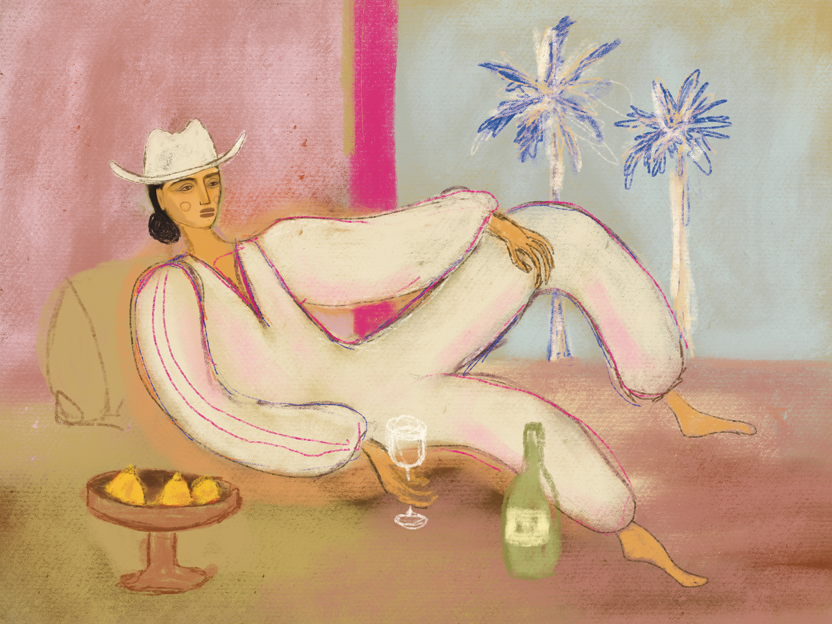 白いカウボーイハットとピンクのラインが入った白い服を着て、ソファでリラックスしている人物を描いたポスター。ピンクとベージュの背景に青いヤシの木とテーブルの上の黄色い果物が描かれています。