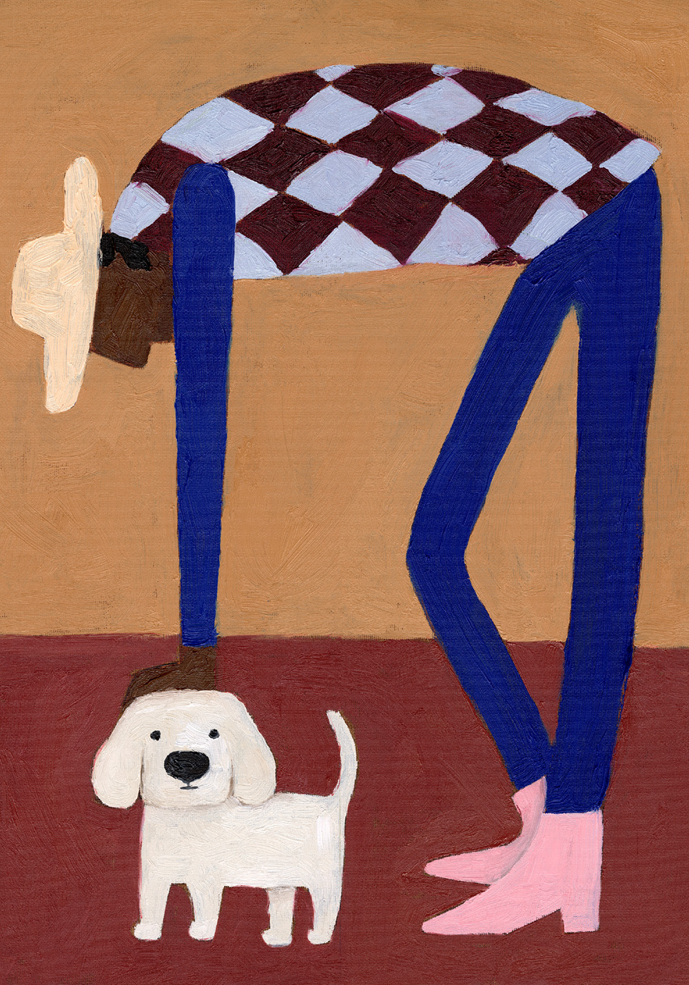 ベージュの帽子をかぶった人が小さな白い犬を撫でている魅力的なポスター。ブルーとブラウンのトーンを使ったシンプルで色鮮やかなイラストが特徴です。