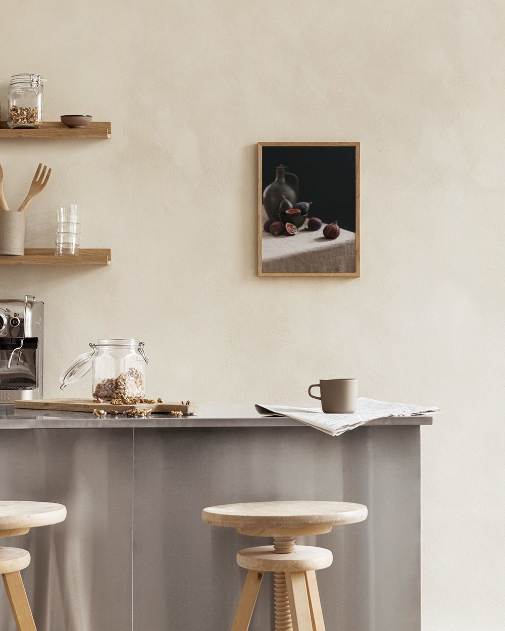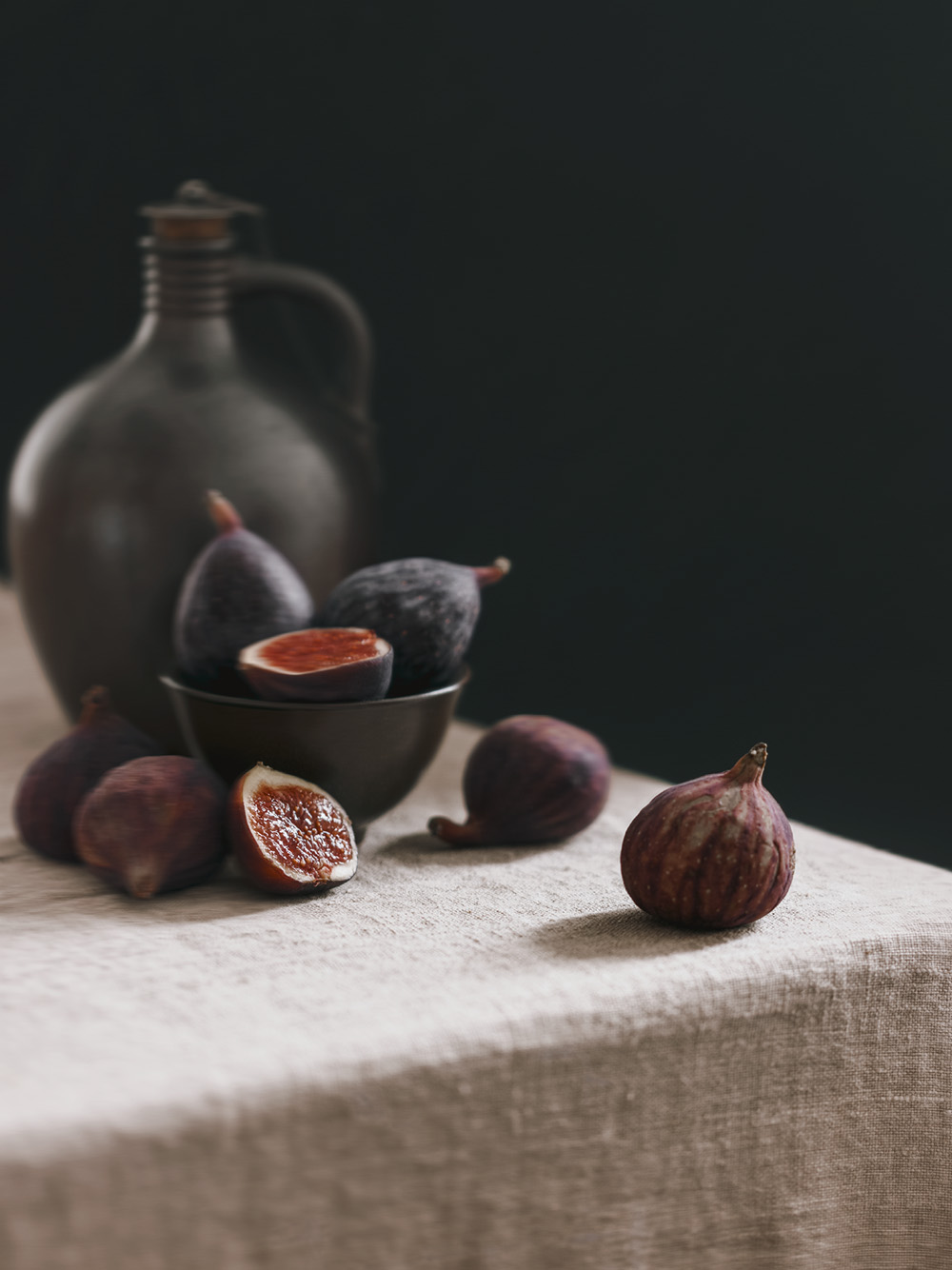 質感のある布の上のボウルに入った紫のイチジクを描いた静物ポスター。一つのイチジクは切り開かれて赤い果肉が見え、暗い水差しの周りにはさらにイチジクが散らばっています。