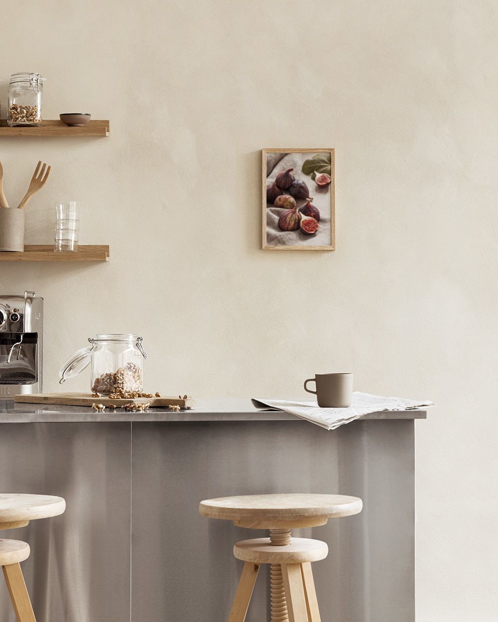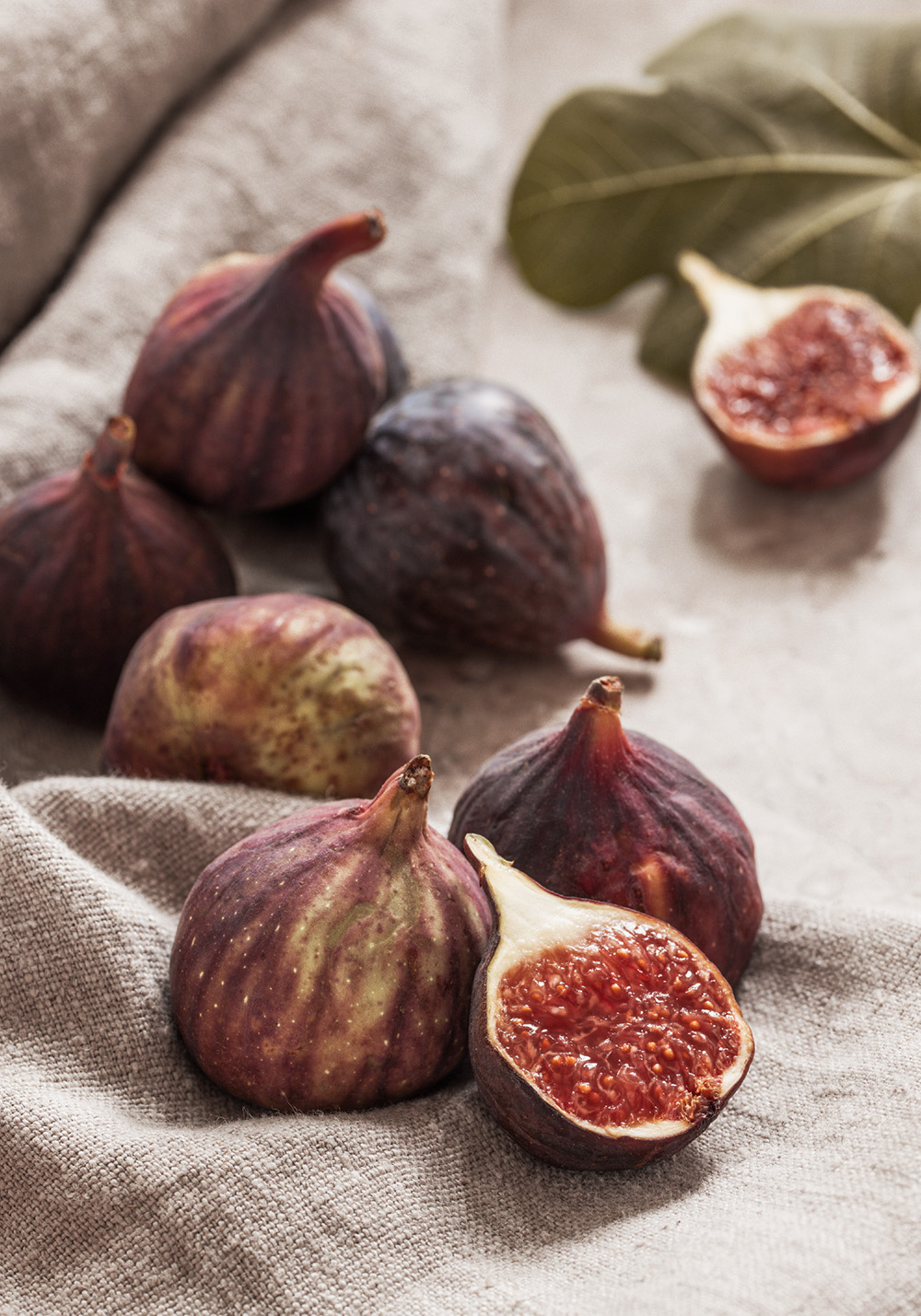 ベージュの布地に紫と緑の色合いの新鮮なイチジクを描いたポスター。一つのイチジクは半分に切られ、赤い種の詰まった内側が見えています。