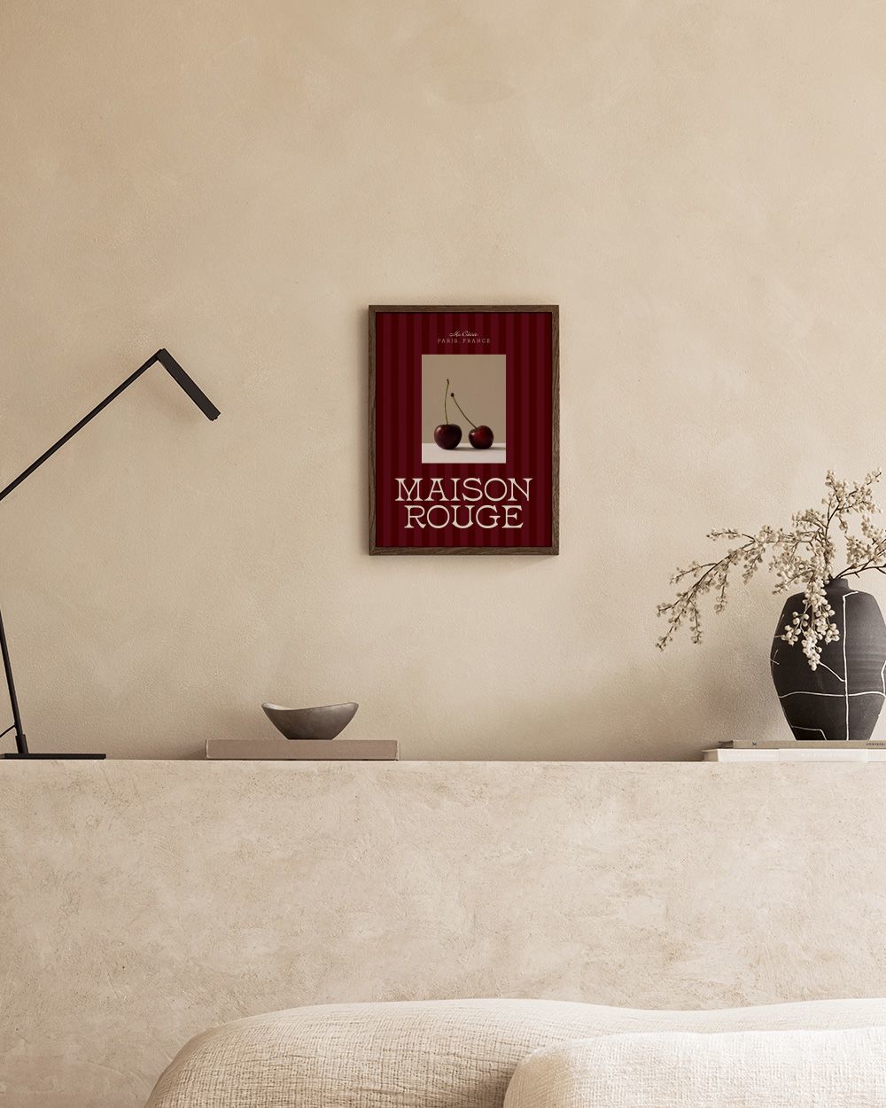 白い表面に2つの赤いさくらんぼが描かれ、フランス語のテキスト「Ma Chérie」と「Maison Rouge」が入った、赤いストライプのボーダーが施されたベージュの背景のスタイリッシュなポスターです。