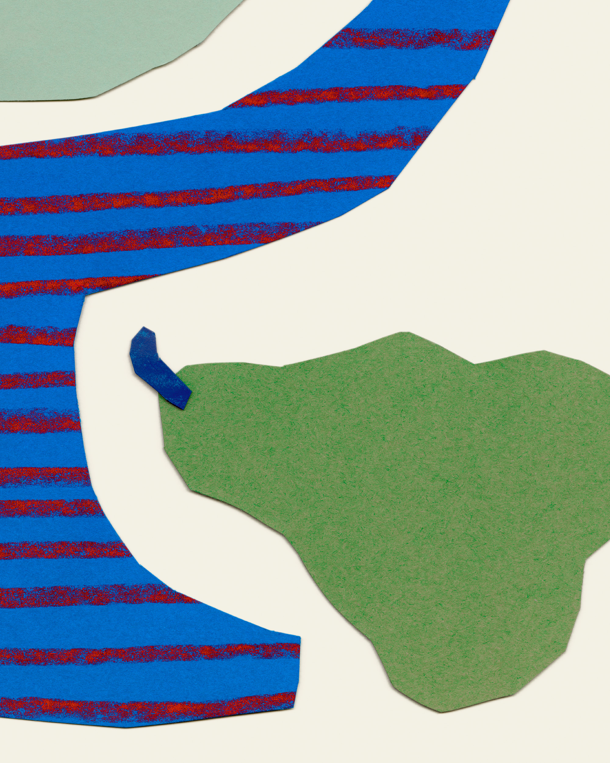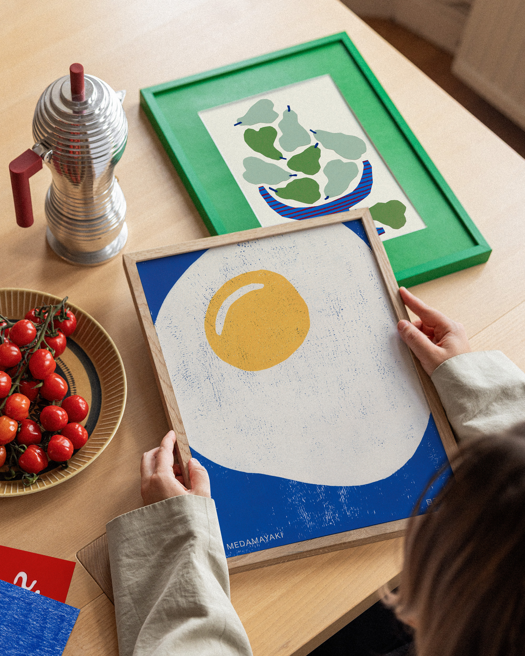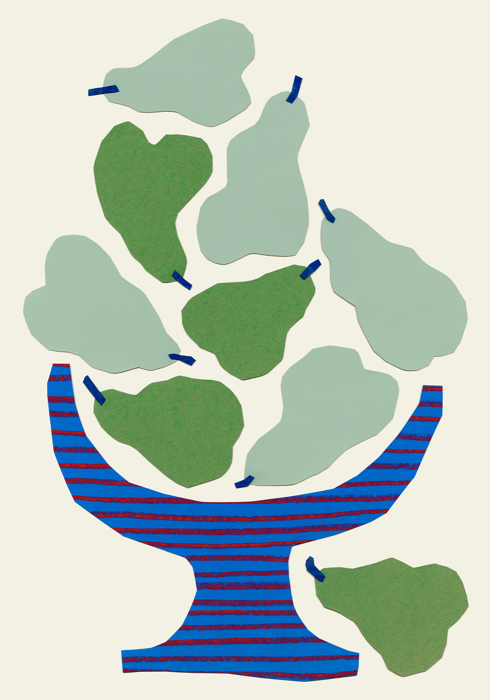 赤いストライプの入った青いボウルに緑の洋梨が入ったポスター。淡いベージュの背景に鮮やかな色彩が映える、シンプルでスタイリッシュなウォールアート。
