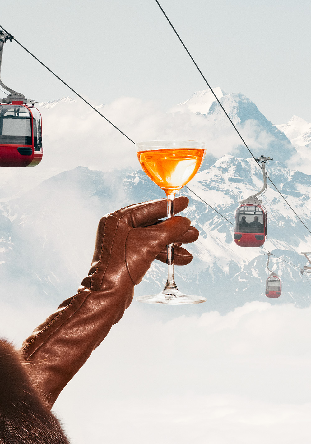 オレンジ色の飲み物が入ったグラスを手袋をはめた手が持っているポスター。雪山と赤いケーブルカーを背景にした茶色の革手袋。