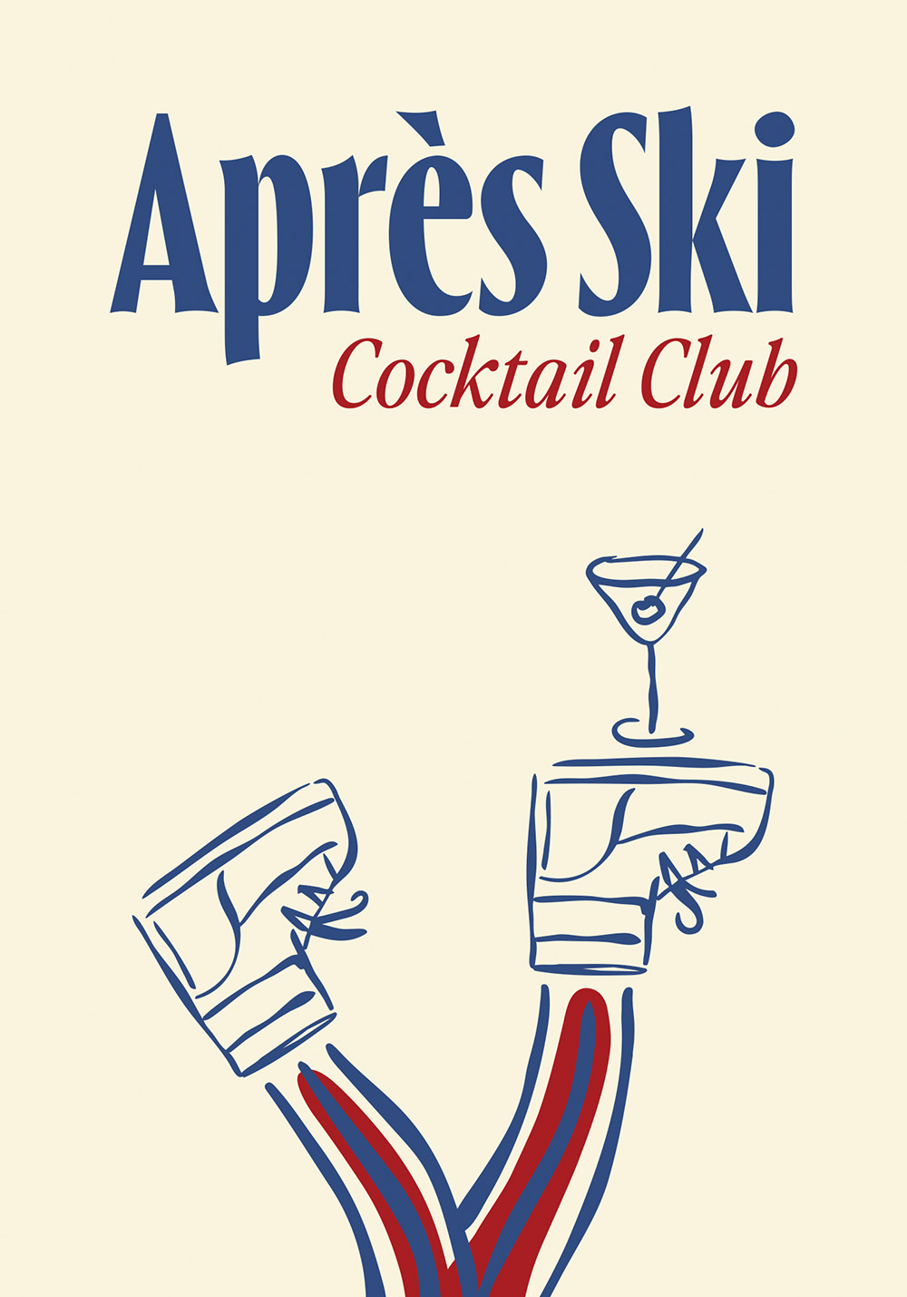 青い"Après Ski"と赤い"Cocktail Club"のテキストが入った楽しいポスター。赤と青のストライプが入ったブーツとカクテルグラスのシンプルなイラストが特徴です。