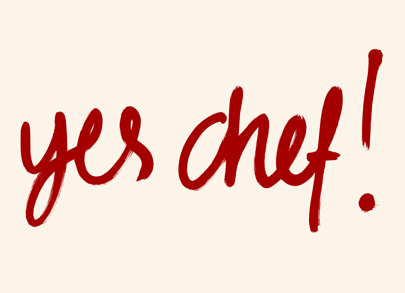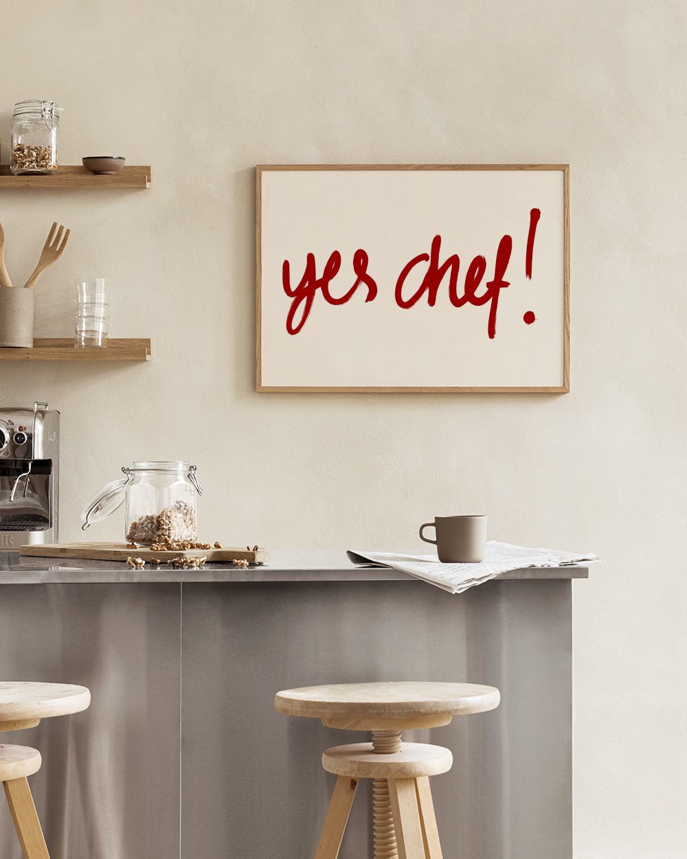 明るいベージュの背景に太字の赤い文字で"Yes Chef!"と書かれた楽しいポスター。料理愛好家にぴったりのキッチンウォールアートです。