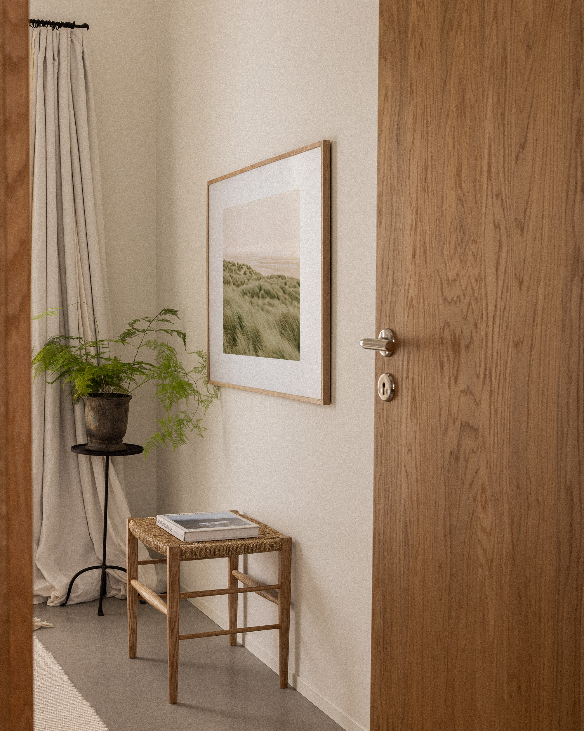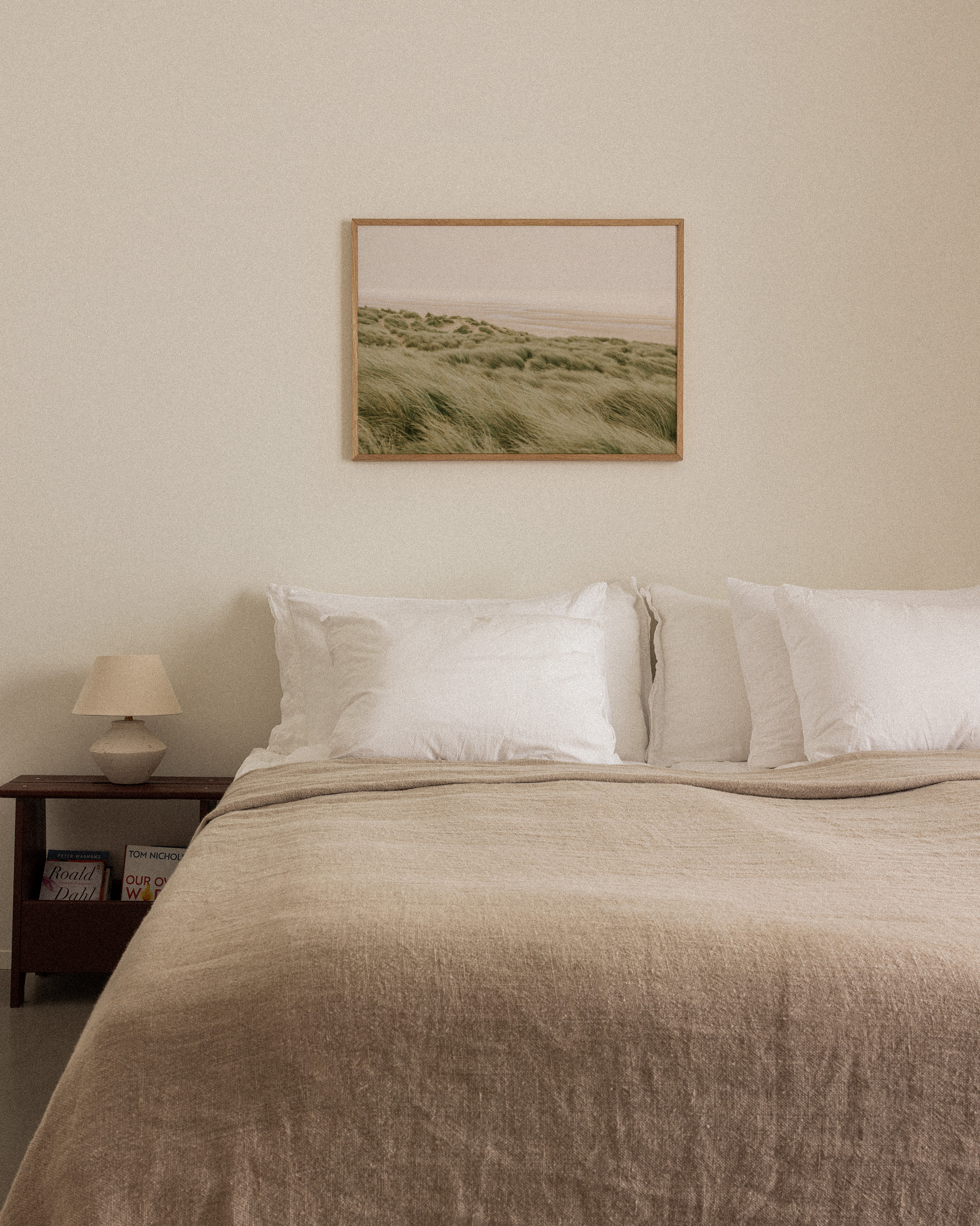 風に揺れる柔らかい草の葉を持つ緑の草原の砂丘、砂浜、薄い曇り空を描いたポスター。落ち着いたグリーンとベージュの色調による、穏やかで静寂なウォールアート。