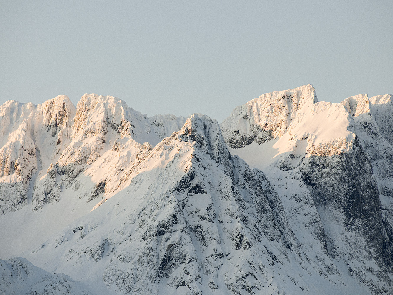 ギザギザした峰を持つ雪に覆われた山々を白とグレーのトーンで描いた美しいポスター。淡いブルーの空を背景にしています。