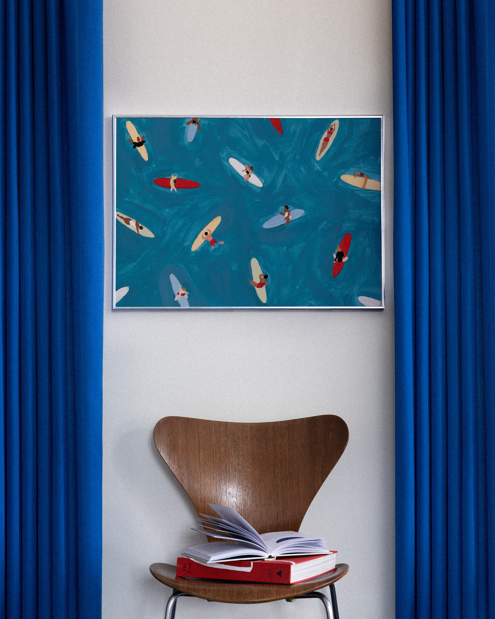 ターコイズブルーの海でサーフボードに乗る人々を上空から撮影した、カラフルなポスター。サーフボードは赤、白、黄色、ライトブルーです。