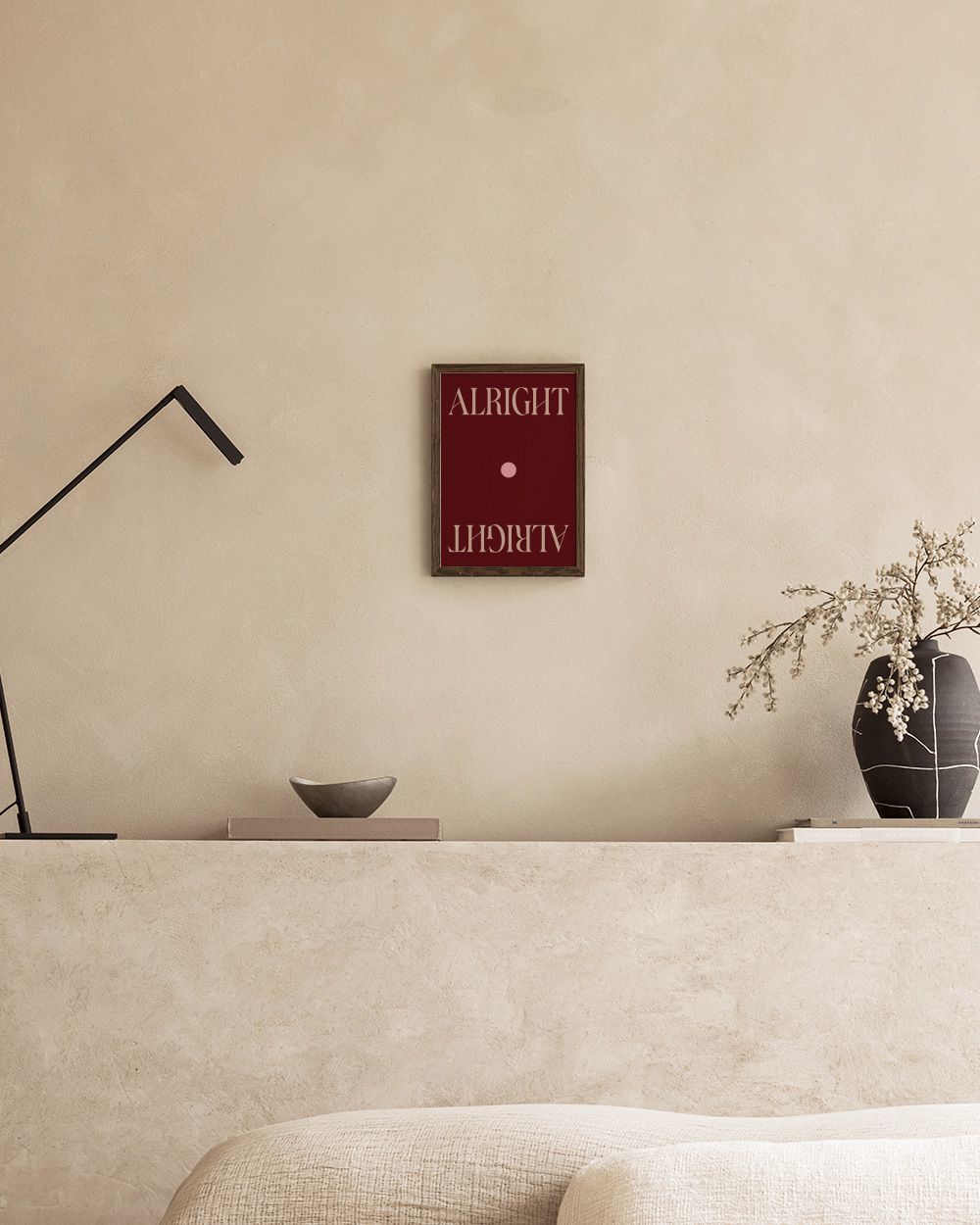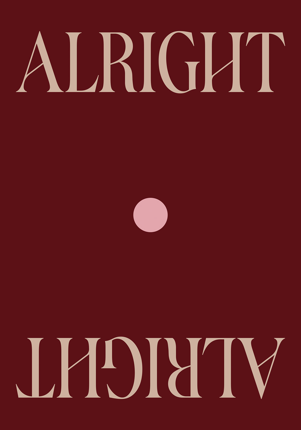 ダークレッドの背景に中央にピンクのドットが入った、ライトブラウンの文字で"ALRIGHT"と書かれたトレンディなポスター。