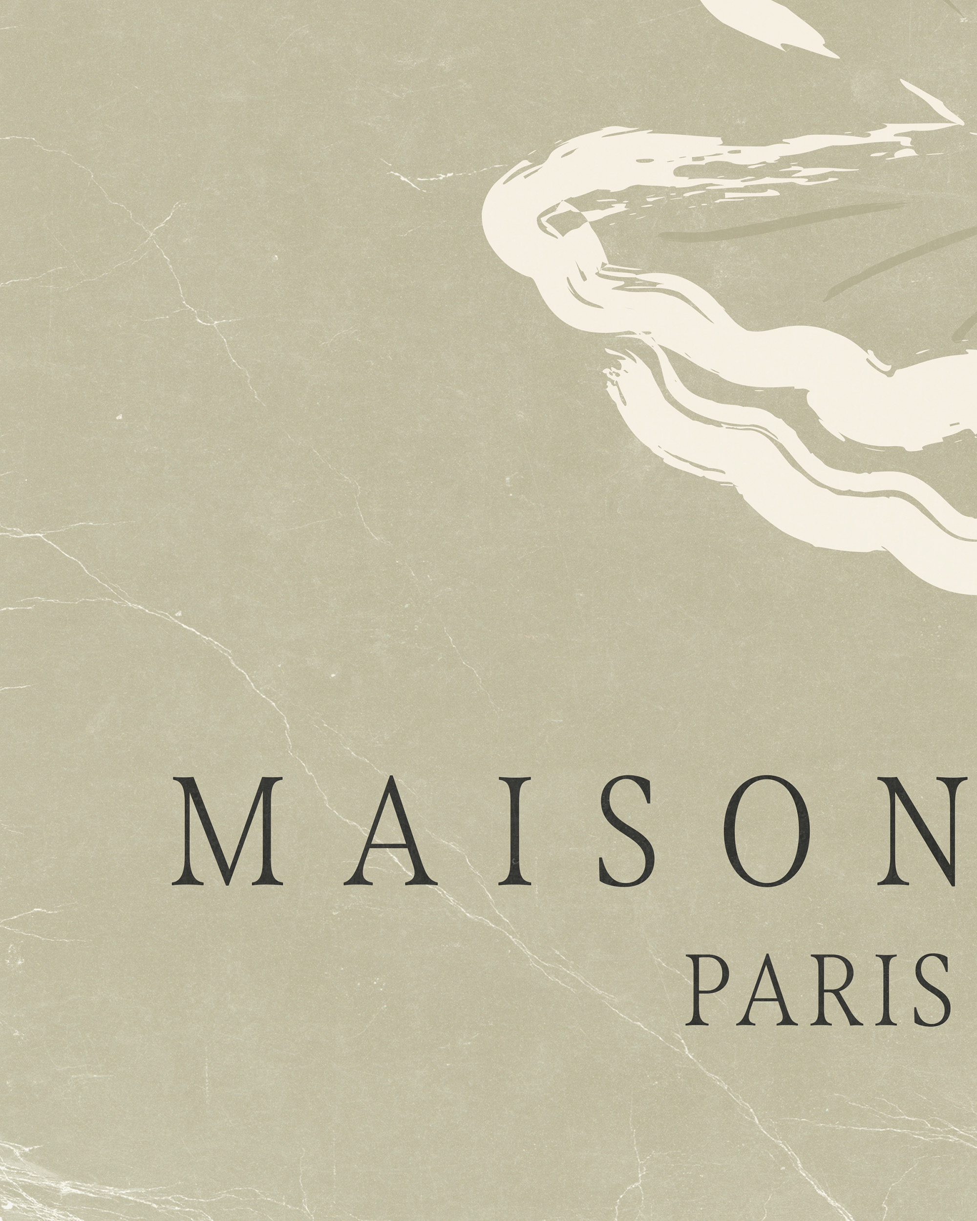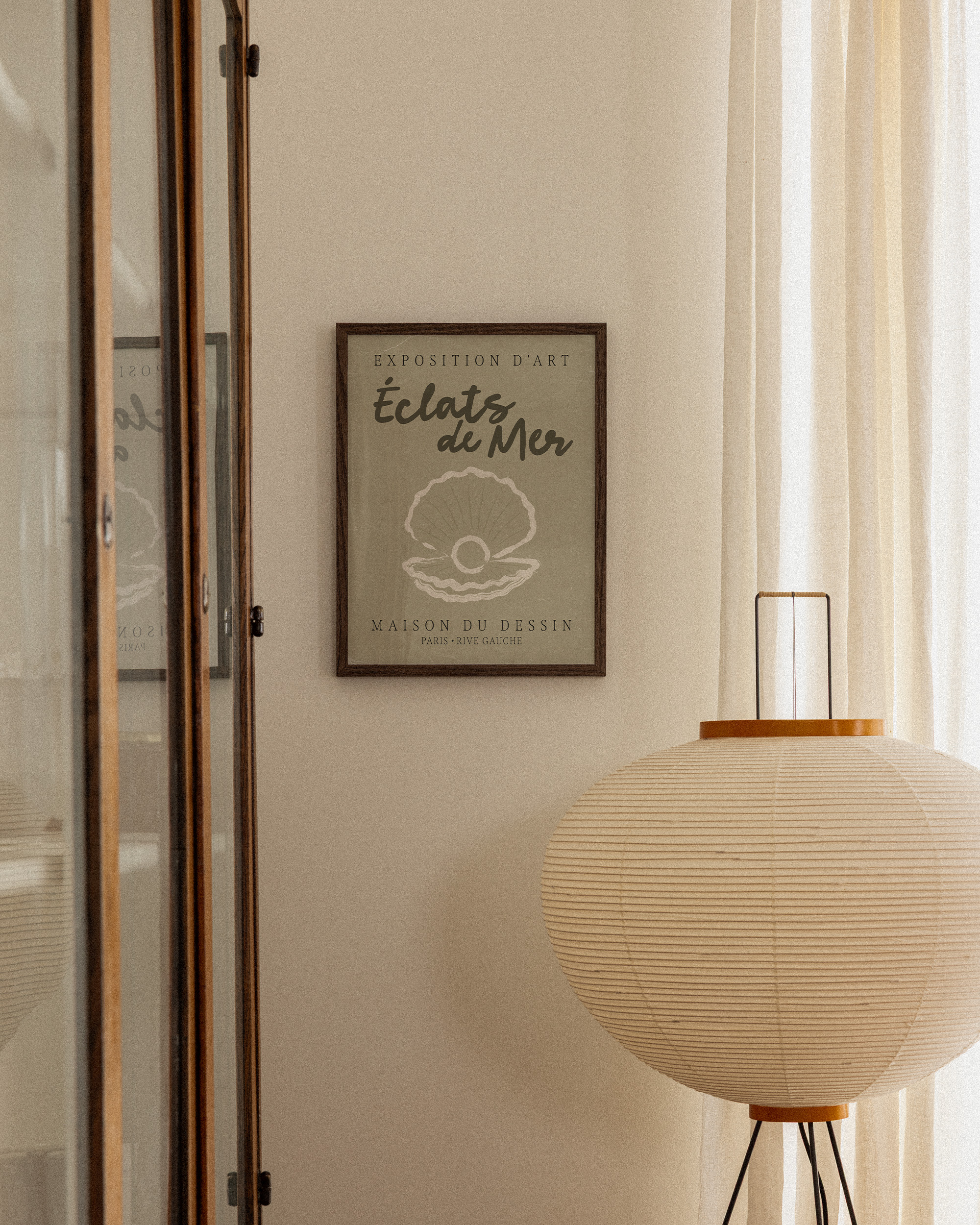 淡い茶色の背景に貝殻のイラストが描かれたポスター。フランス語のテキスト"Éclats de Mer"が特徴的で、独特な見た目を演出するテクスチャー仕上げが施されています。