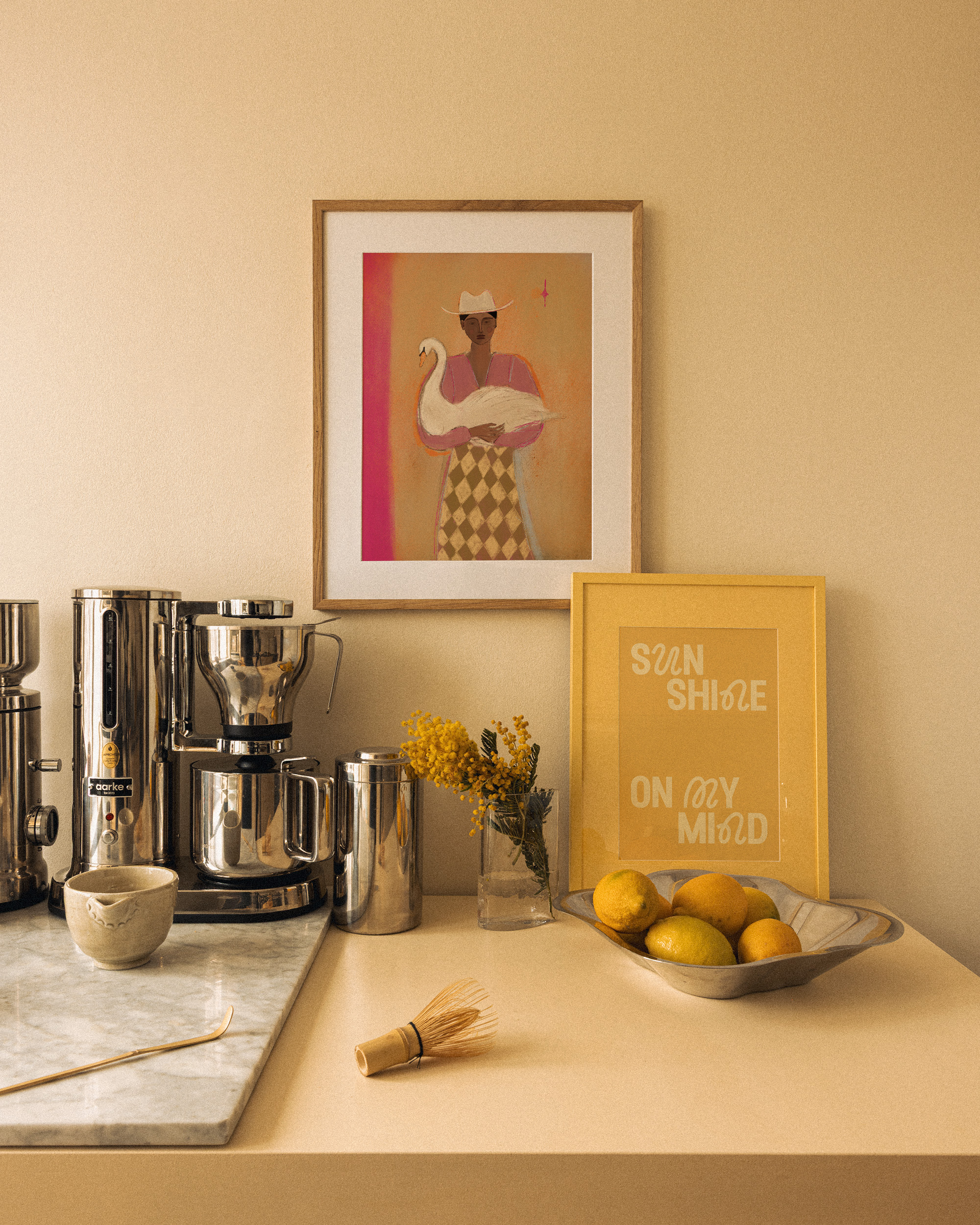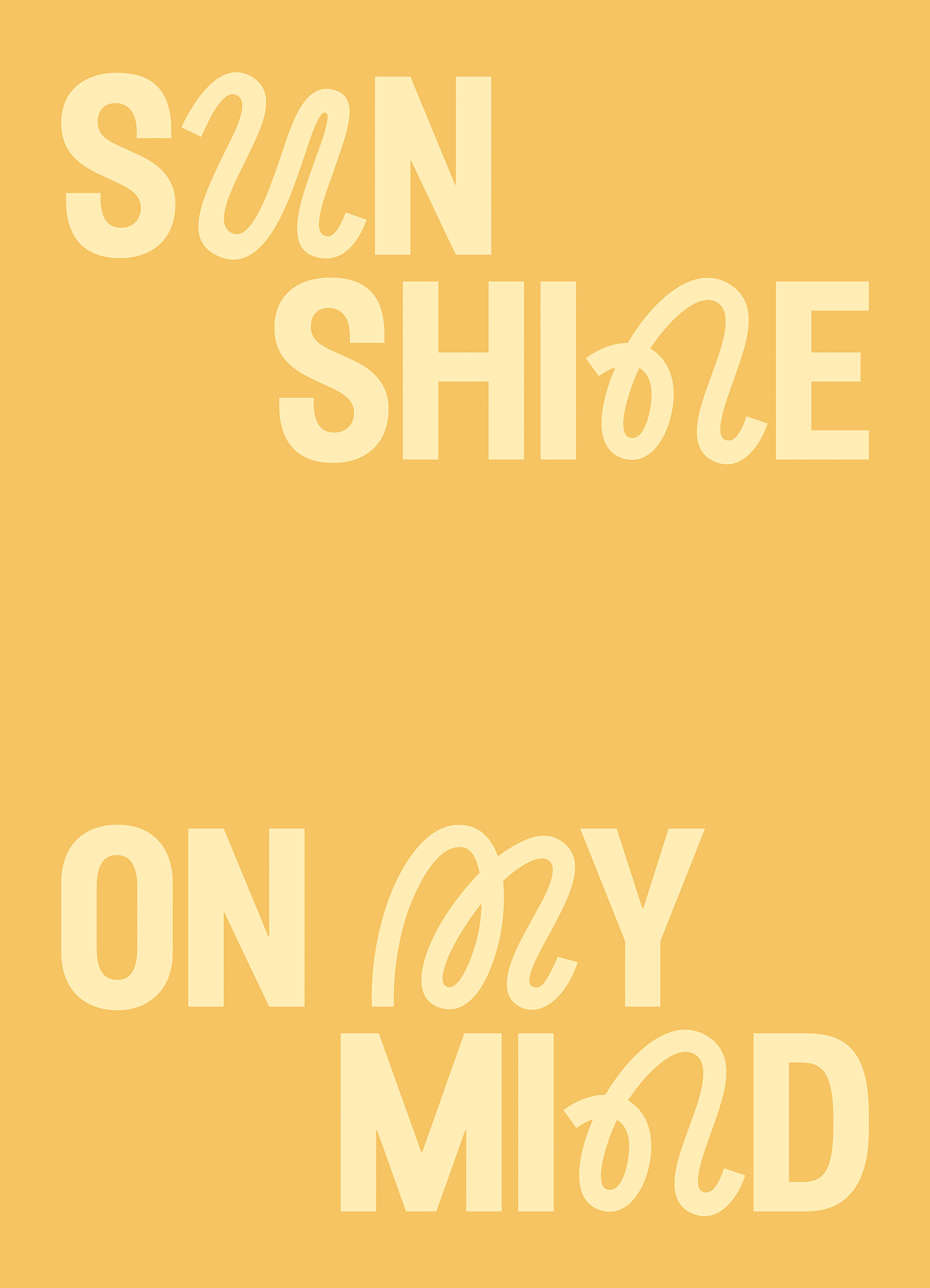 「Sunshine on My Mind」という文字が淡い黄色で書かれた黄色いポスター。どんなお部屋も明るくしてくれる、明るくシンプルなポスターです。