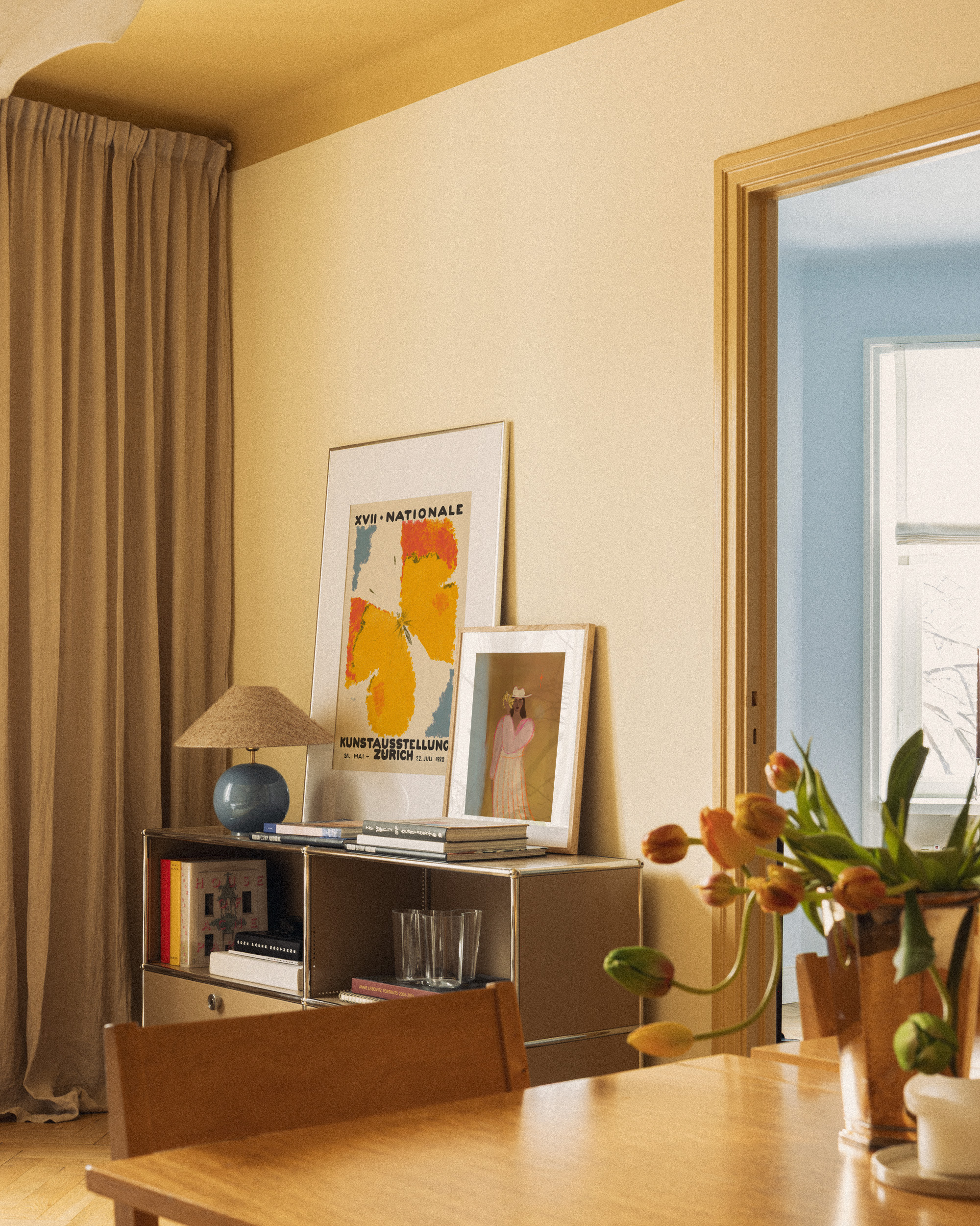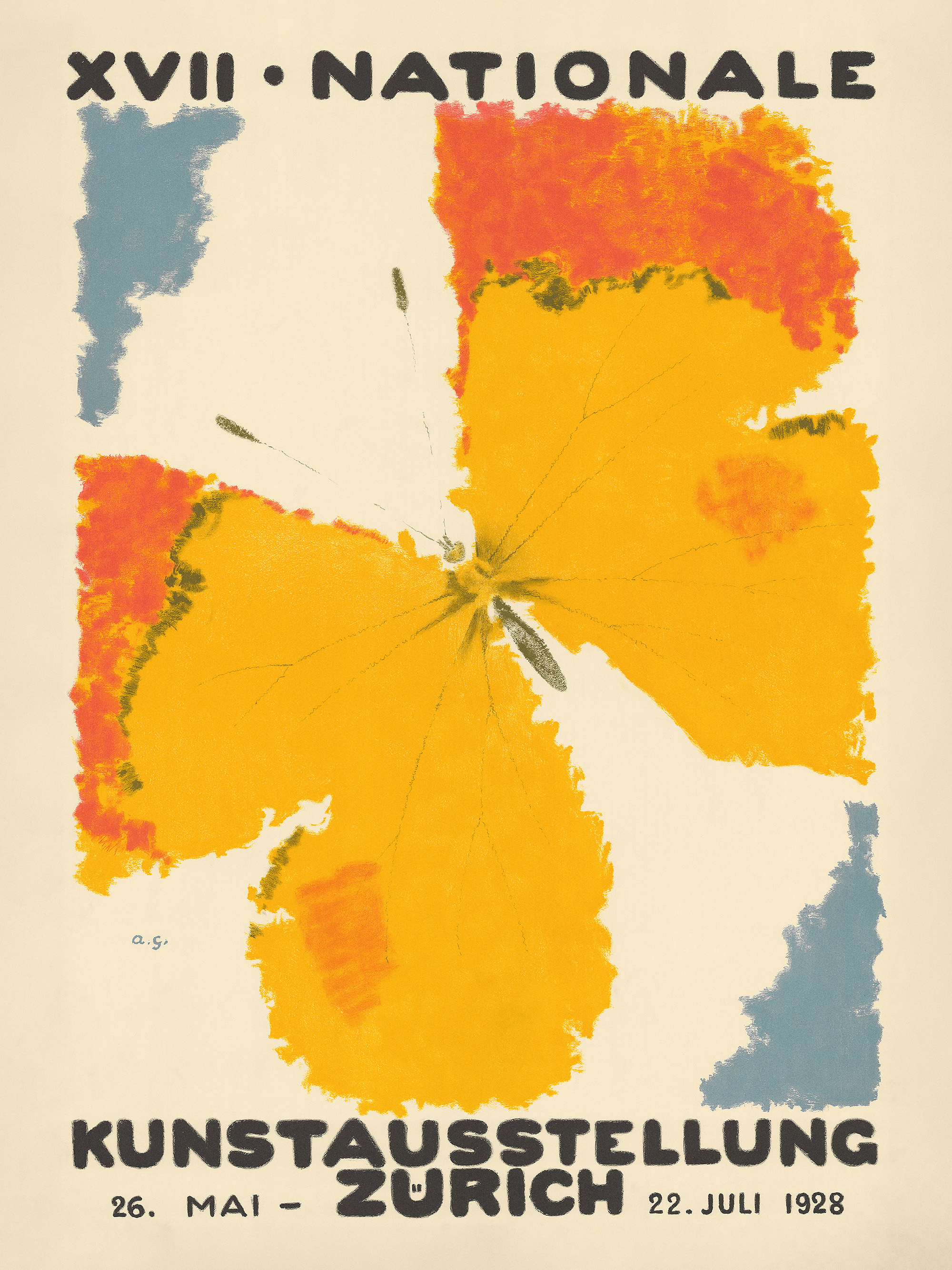 黄色とオレンジの羽を持つ大きな抽象的な蝶が描かれたポスター。背景は明るく、両側に青い形があり、美しいヴィンテージ風のポスターです。